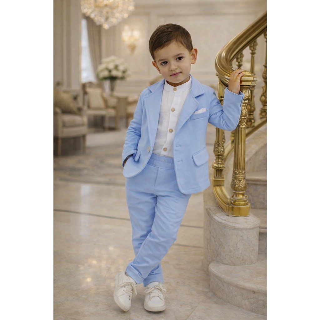 Štýlový set pre mladého gentlemana, ktorý kombinuje pohodlie a elegantný vzhľad. Ideálny pre slávnostné príležitosti, rodinné oslavy alebo školské akcie.