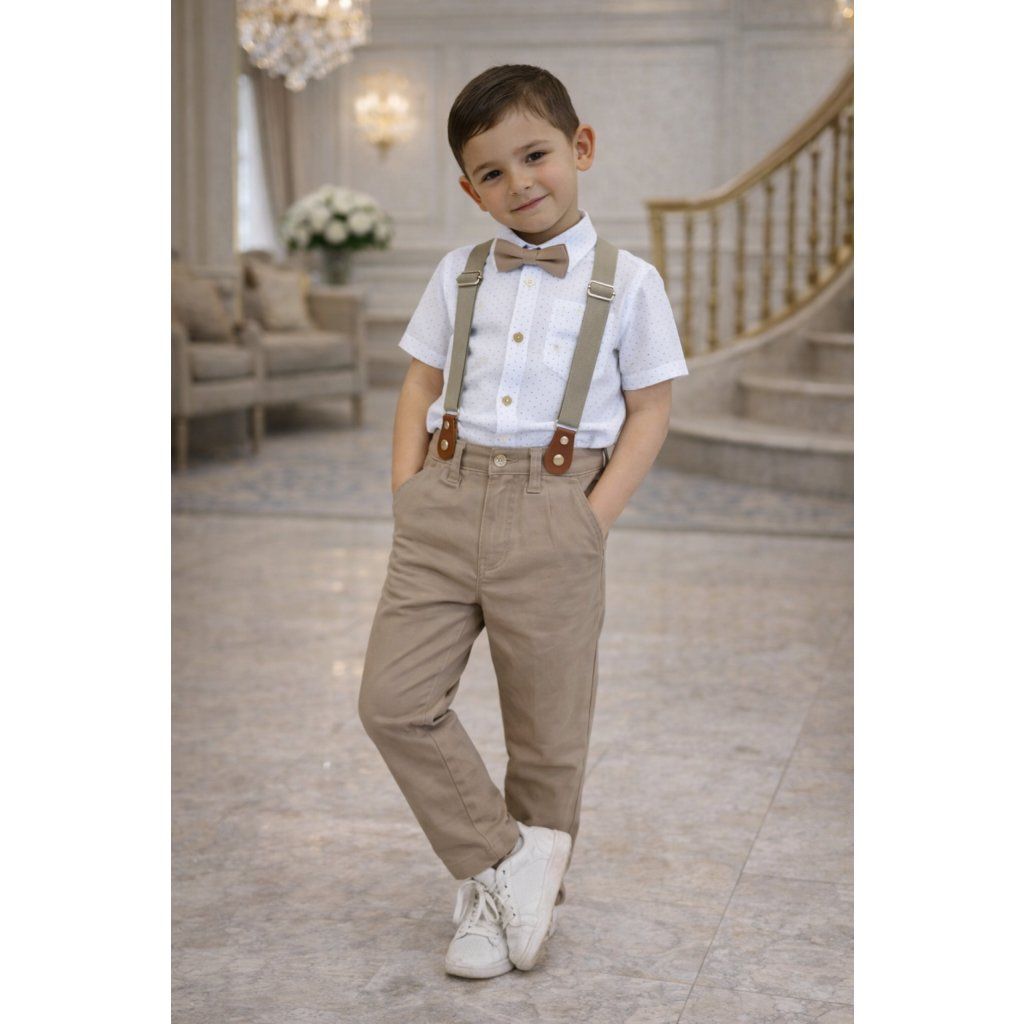 Elegantný chlapčenský set, ktorý zaujme na prvý pohľad svojím vkusným a premysleným prevedením. Súčasťou outfitu je košeľa s krátkym rukávom zdobená jemným bodkovaným vzorom, ktorá pôsobí sviežo a zároveň štýlovo. Nechýba ani motýlik, ktorý dodáva celému looku slávnostný nádych.