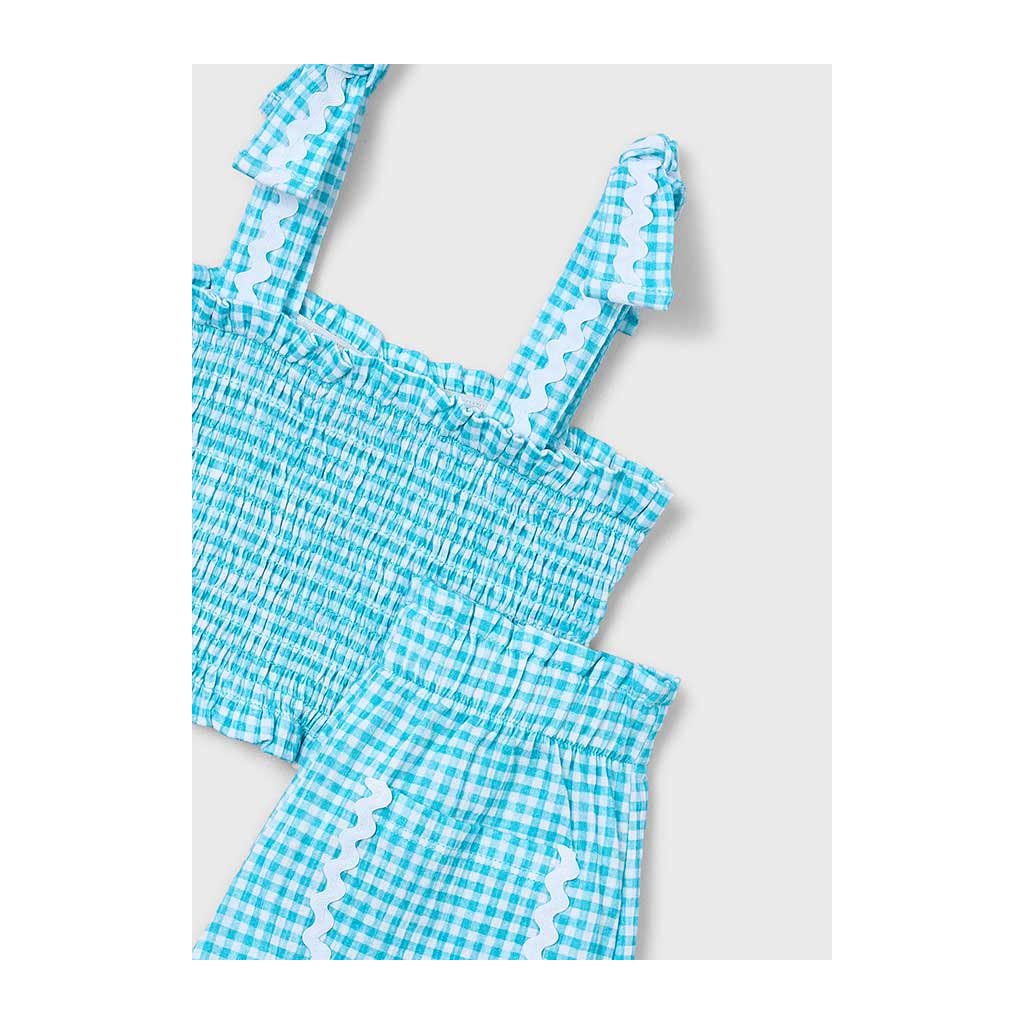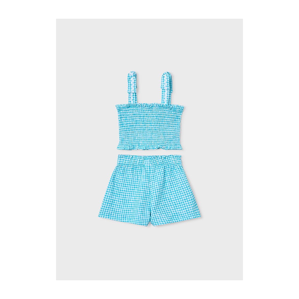 Kockovaný letný set s jemnými našitými vlnkami a mašličkovými ramienkami