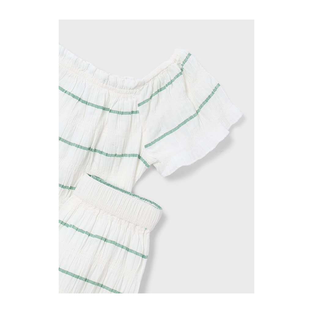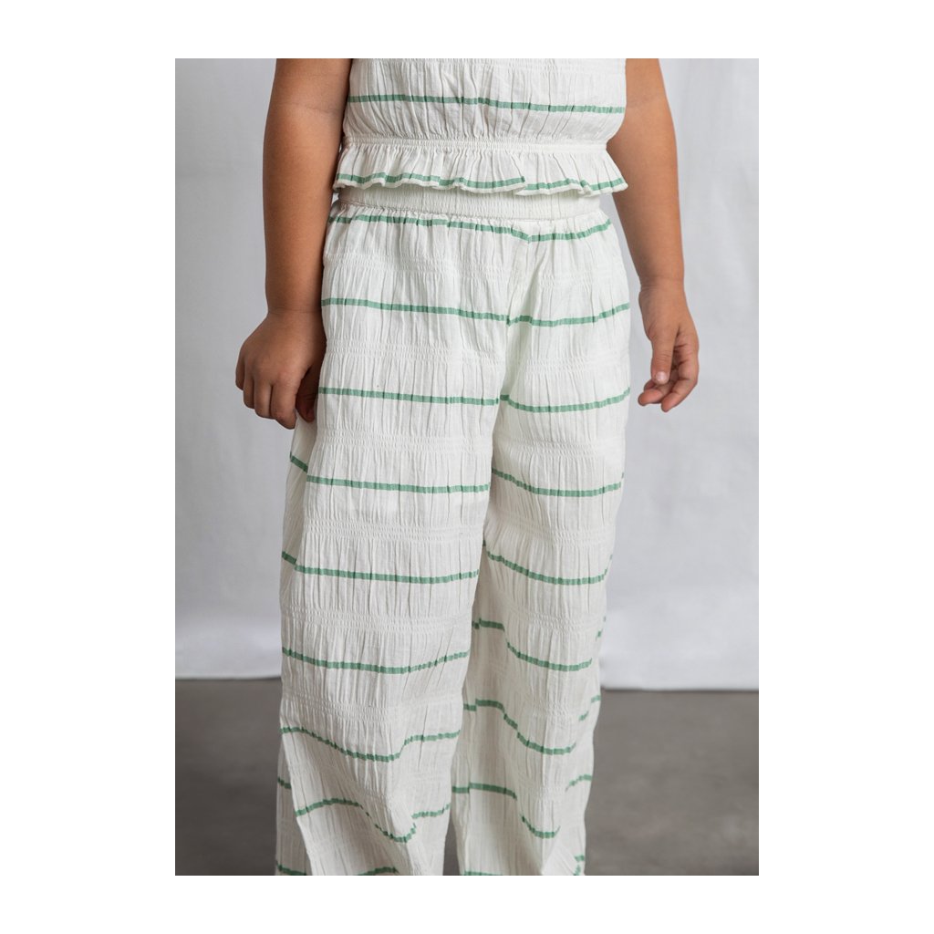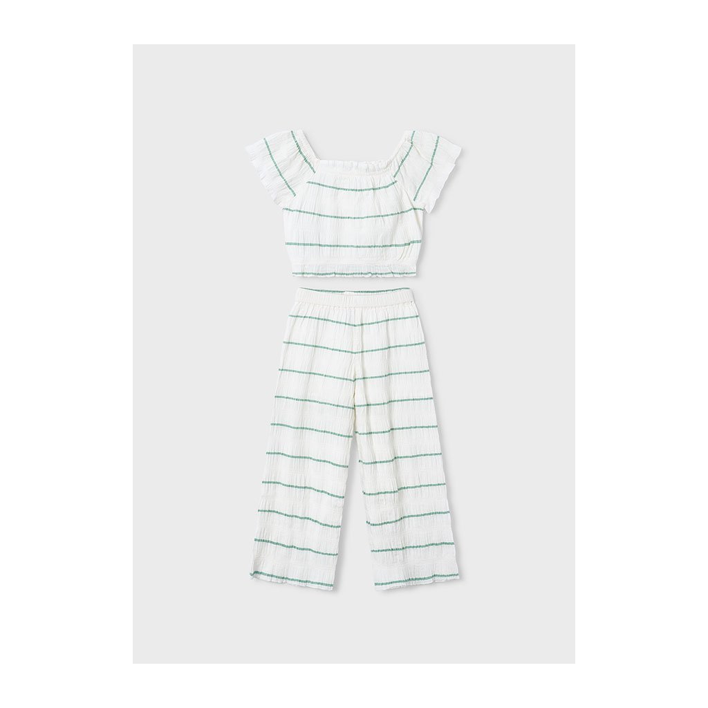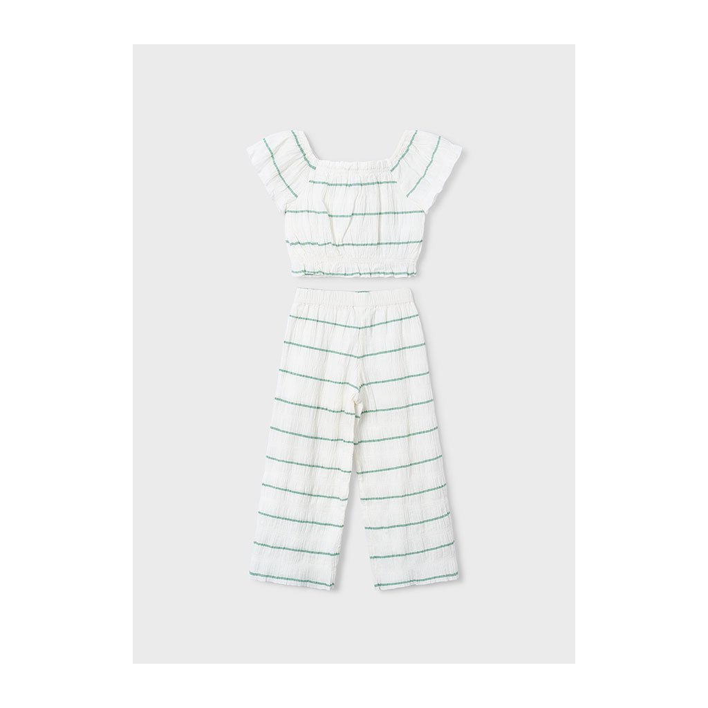 Letný set pre dievčatá z nekrčivého materiálu je ideálny na pohodlné a praktické nosenie počas horúcich dní. Set má jemné mint pásiky, ktoré dodávajú svieži a hravý vzhľad. Súčasťou sú široké nohavice a tričko s odhalenými ramenami, ktoré zvýrazňujú letný štýl a pohodlie.