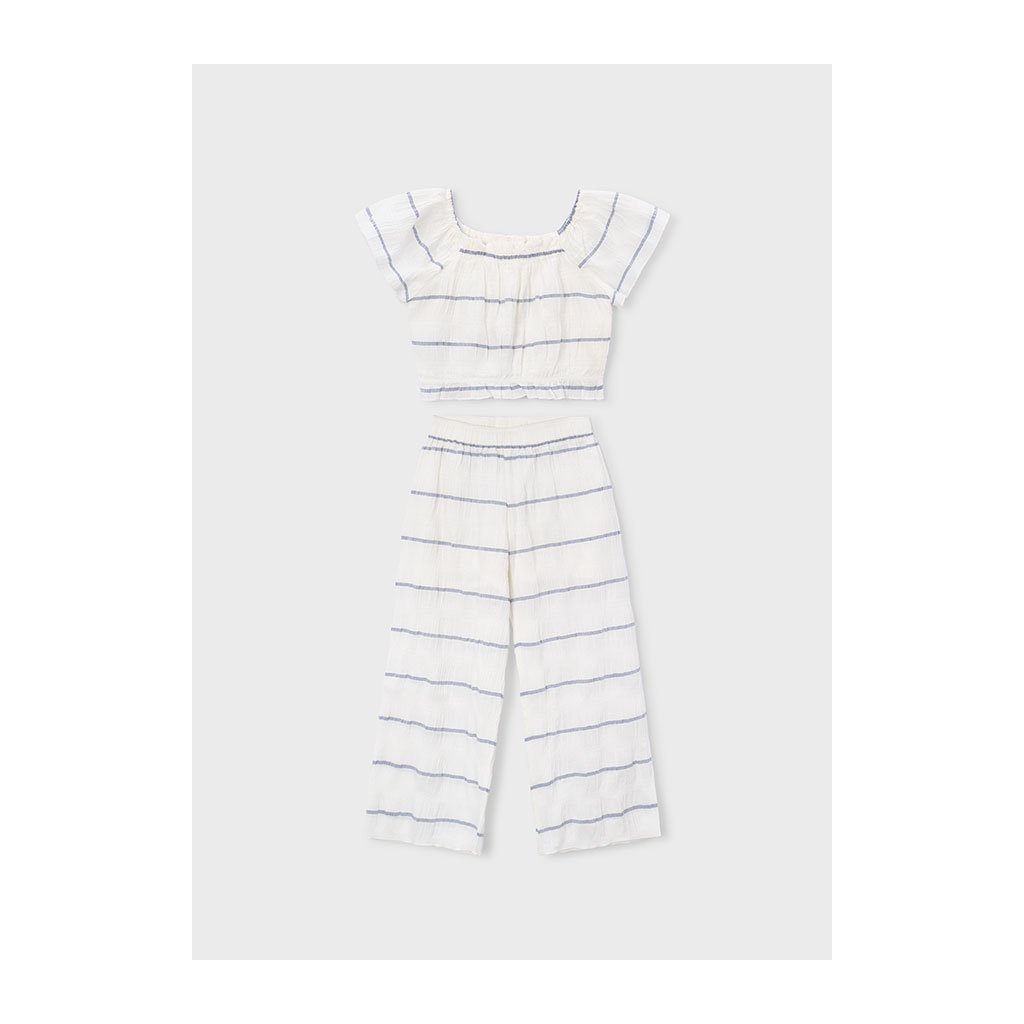 Letný set pre dievčatá z nekrčivého materiálu je ideálny na pohodlné a praktické nosenie počas horúcich dní. Set má jemné mint pásiky, ktoré dodávajú svieži a hravý vzhľad. Súčasťou sú široké nohavice a tričko s odhalenými ramenami, ktoré zvýrazňujú letný štýl a pohodlie.