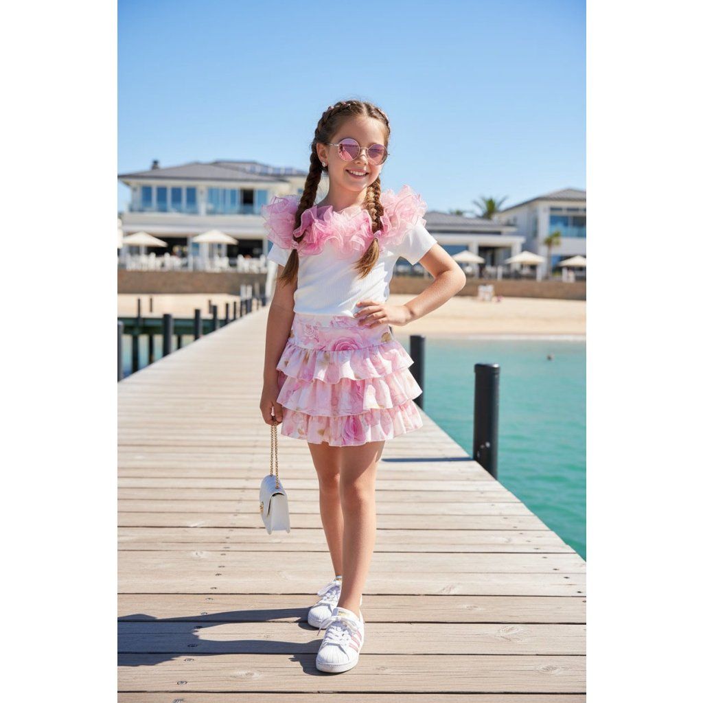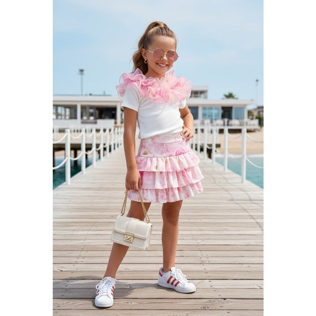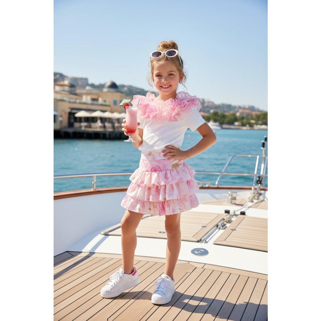 Dievčenský letný set pozostáva z trička a sukne v elegantnom a hravom prevedení, ideálny na dovolenku aj voľnočasové aktivity. Tričko je zdobené tylovými volánmi vo výraznej farbe, ktoré dodávajú outfitu živý a veselý vzhľad. Sukňa je farebne zladená s volánmi na tričku a dopĺňa celkový štýl harmonickým spôsobom. Set je vyrobený z ľahkého a pohodlného materiálu, ktorý zabezpečuje komfort počas celého dňa.