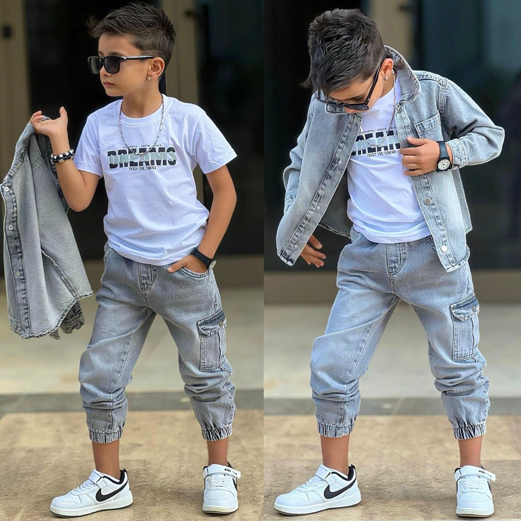 Štýlový rifľový set pre chlapcov, ideálny na každodenné nosenie. Biele tričko s moderným nápisom tvorí základ outfitu. Rifľová bunda má praktické zapínanie na cvoky a pohodlný strih.