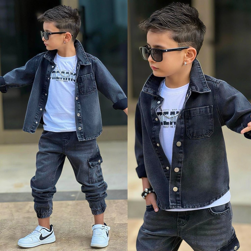 Štýlový rifľový set pre chlapcov, ideálny na každodenné nosenie. Biele tričko s moderným nápisom tvorí základ outfitu. Rifľová bunda má praktické zapínanie na cvoky a pohodlný strih.