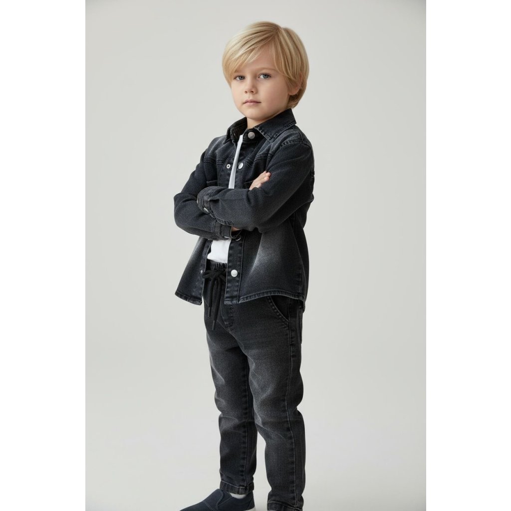 Štýlový rifľový set pre chlapcov, ideálny na každodenné nosenie. Biele tričko s moderným nápisom tvorí základ outfitu. Rifľová bunda má praktické zapínanie na cvoky a pohodlný strih.