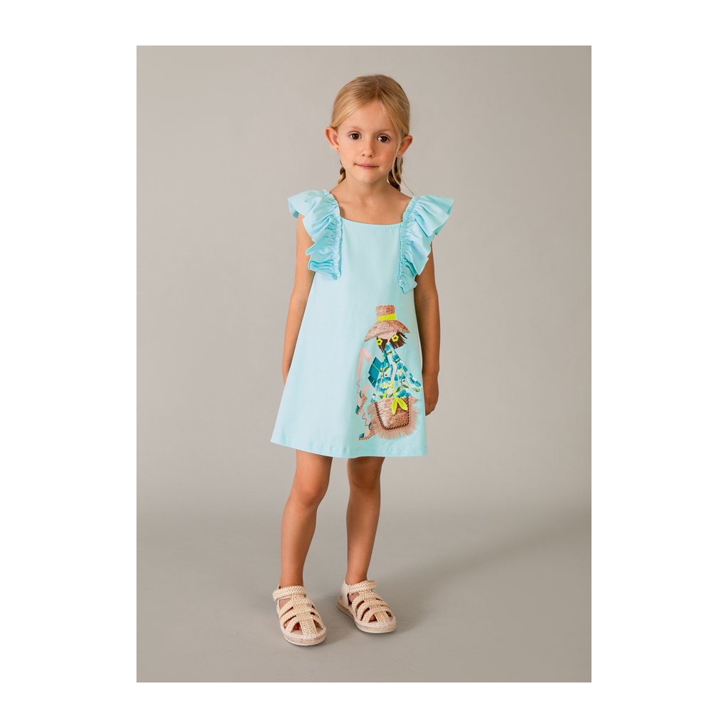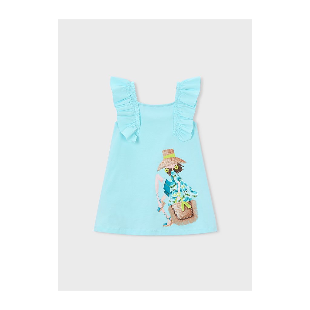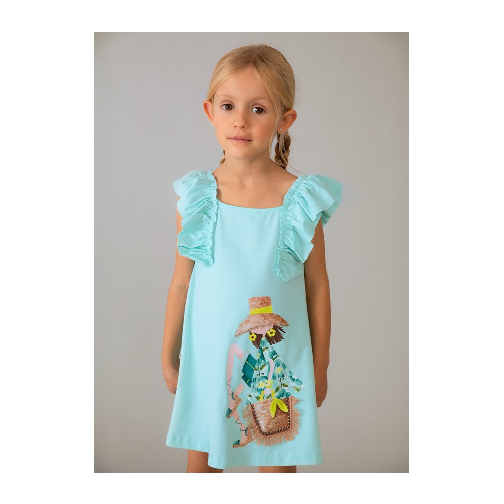 Tyrkysové dievčenské šaty majú príjemný a priedušný materiál, ktorý zabezpečuje pohodlné nosenie počas celého dňa v meste či na pláži. Veselá potlač bábiky dodáva šatám hravý a dievčenský vzhľad. Ramienka sú zakončené volánmi, ktoré šatám dodávajú jemnosť a letný štýl.