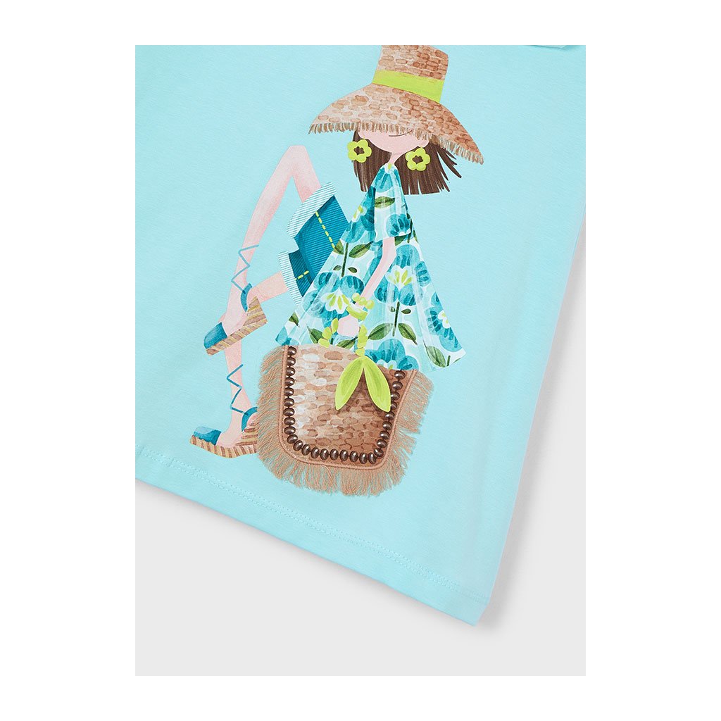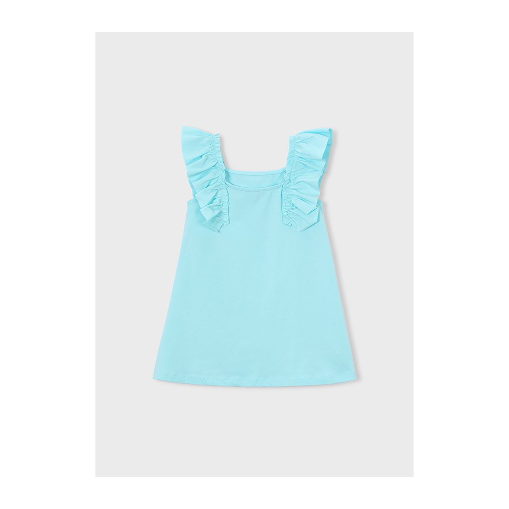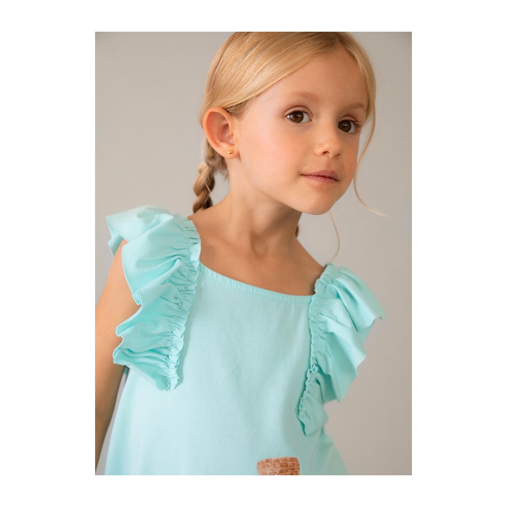 Tyrkysové dievčenské šaty majú príjemný a priedušný materiál, ktorý zabezpečuje pohodlné nosenie počas celého dňa v meste či na pláži. Veselá potlač bábiky dodáva šatám hravý a dievčenský vzhľad. Ramienka sú zakončené volánmi, ktoré šatám dodávajú jemnosť a letný štýl.