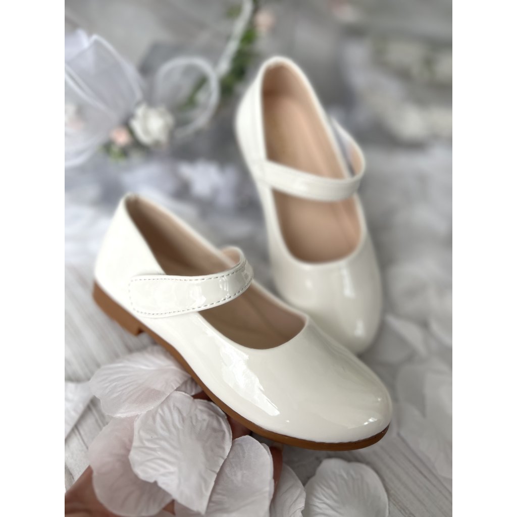 Elegantné biele balerínky sú ideálnou voľbou k 1. svätému prijímaniu aj iným slávnostným príležitostiam. Vyrobené z kvalitného lakovaného materiálu, ktorý dodáva topánkam jemný lesk a slávnostný vzhľad. Jednoduchý, nadčasový dizajn krásne doplní prijímacie šaty a zároveň zabezpečí pohodlie počas celého dňa.