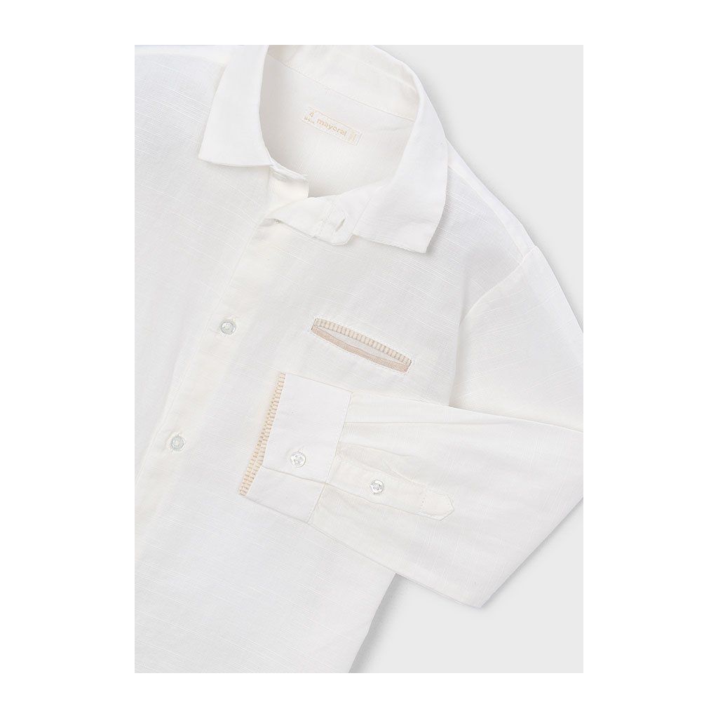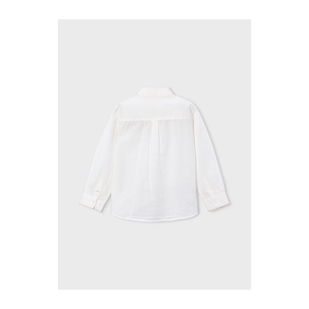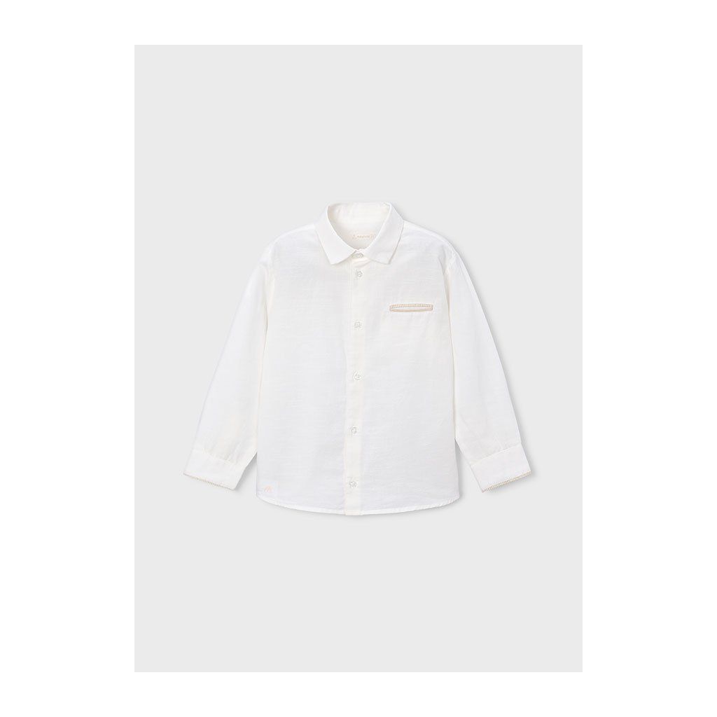 Biela košeľa s dlhým rukávom pôsobí čisto, elegantne a nadčasovo. Jemné modré lemovanie na náprsnom vrecku, golieri (vačku) a na koncoch rukávov dodáva košeli moderný a štýlový detail bez narušenia klasického vzhľadu. Vďaka pohodlnému strihu a príjemnému materiálu je vhodná na slávnostné príležitosti, školské akcie aj bežné nosenie. Skvelo sa kombinuje s nohavicami aj džínsami.