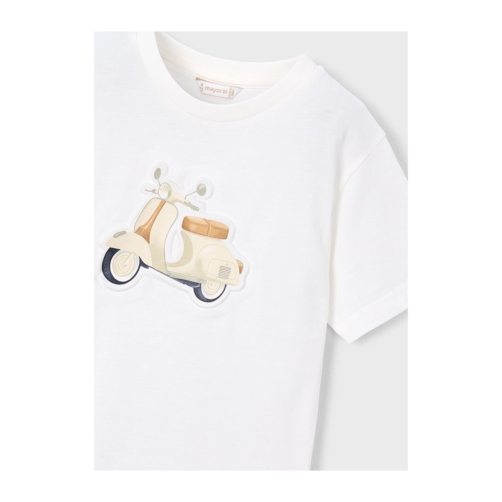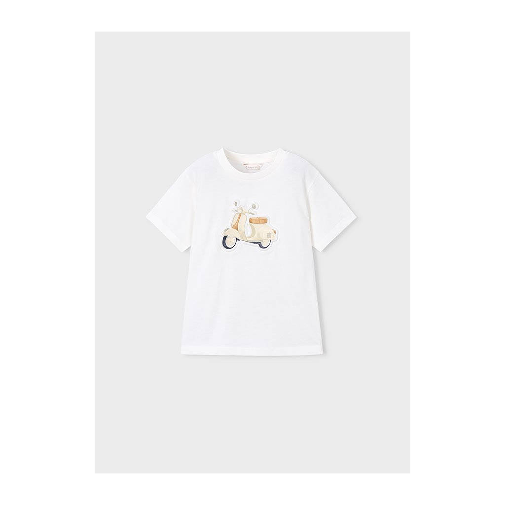 Bavlnené chlapčenské tričko značky Mayoral na každodenné nosenie. Na prednej strane je oblúbená potlač motorky, ktorá určite zaujme každého malého dobrodruha. Tričko má klasický strih s okrúhlym výstrihom a krátkymi rukávmi, takže sa ľahko kombinuje s nohavicami alebo kraťasmi.