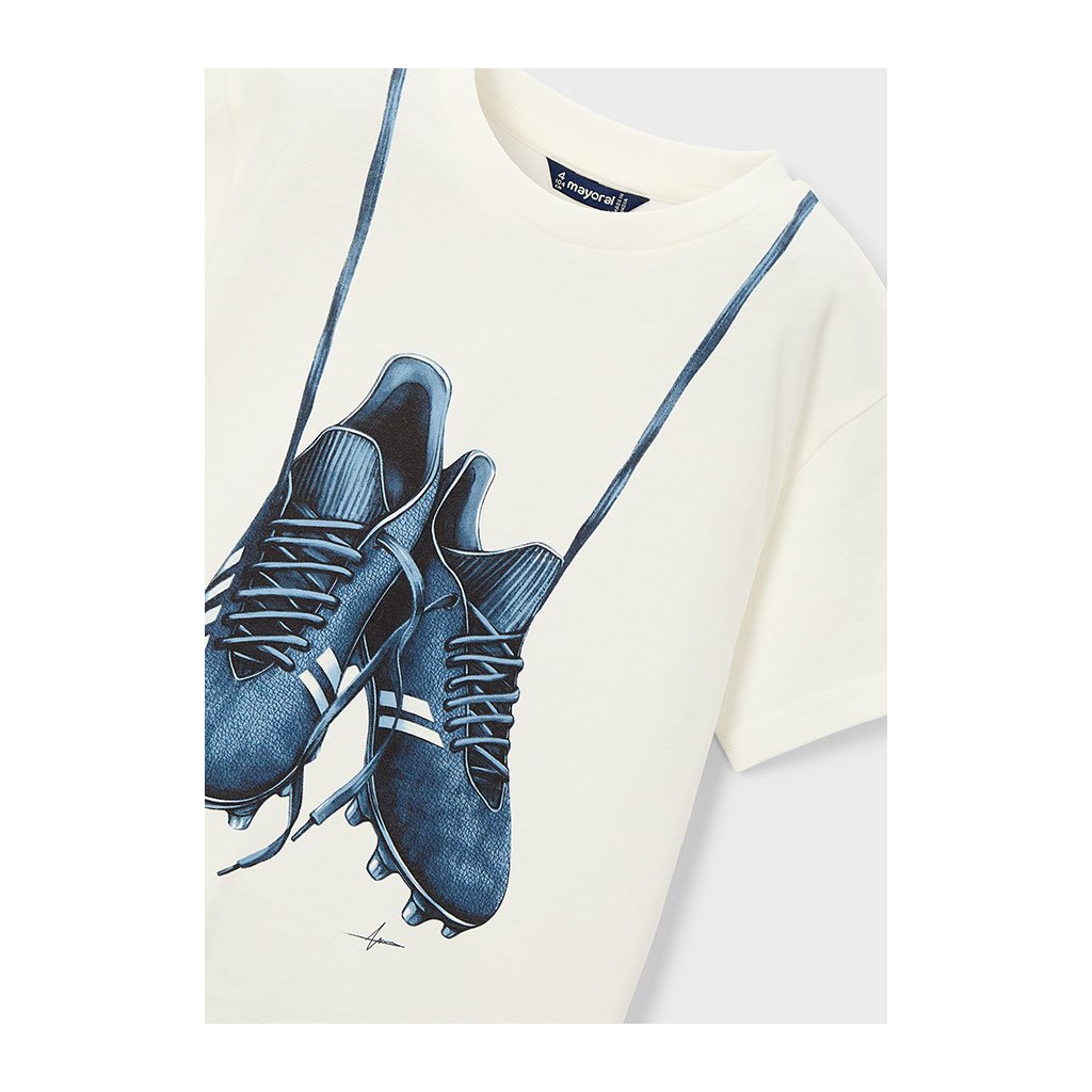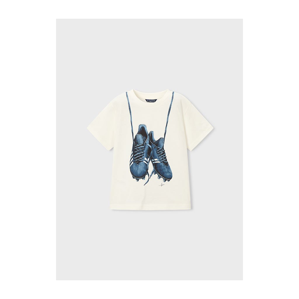 Chlapčenské tričko značky Mayoral pre malých futbalistov. Vpredu potlač kopačiek, ktorá poteší každého malého fanúšika športu. Tričko má krátke rukávy a klasický strih, ktorý umožňuje voľný pohyb pri hrách aj športových aktivitách. Perfektné na voľný čas, do školy alebo na hry vonku.