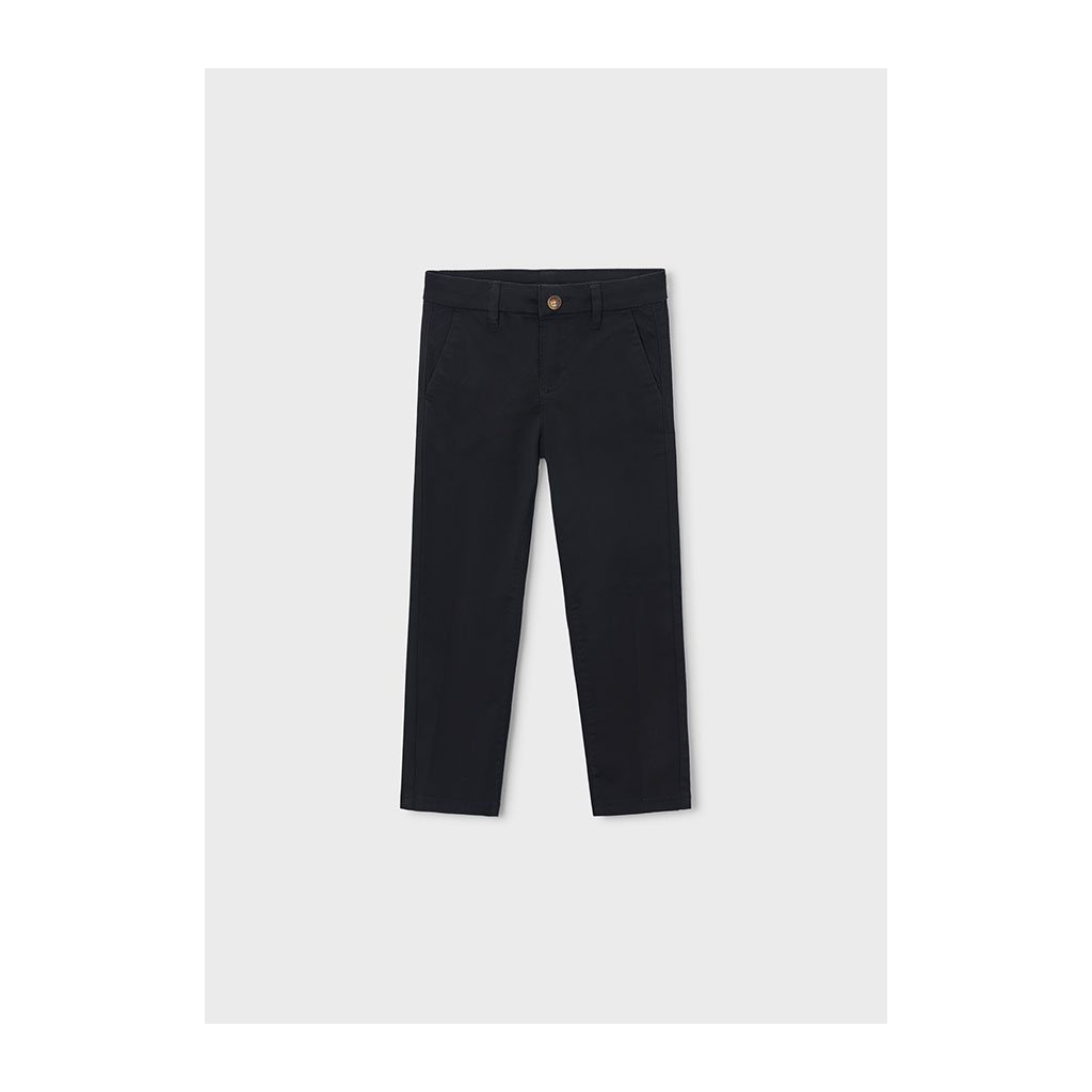 Športovo-elegantné chlapčenské nohavice Mayoral Chino Slim spájajú moderný dizajn s maximálnym pohodlím. Úzky slim fit strih dodáva nohaviciam upravený a štýlový vzhľad. Klasické zapínanie na gombík podčiarkuje ich elegantný charakter, zatiaľ čo nastaviteľný pás s vnútornou gumičkou umožňuje jednoduché a presné prispôsobenie pása postave dieťaťa.