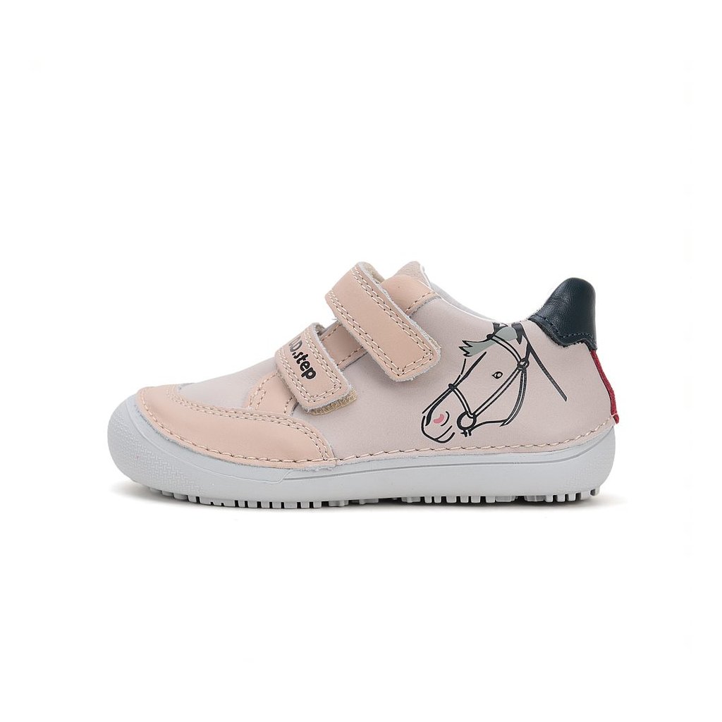 Kožená detská obuv, prechodné topánky zn. D.D.STEP s ortopedickou vložkou a tvarovanou klenbou. Obuv je vhodná pre najmenšie detičky, ktoré sa učia chodiť, pretože sú mäkkučké, ľahučké a veľmi ohybné. Sú vhodné na prechodné obdobie. Zapínanie je na suchý zips. Vpredu je vyvýšená guma proti okopaniu.