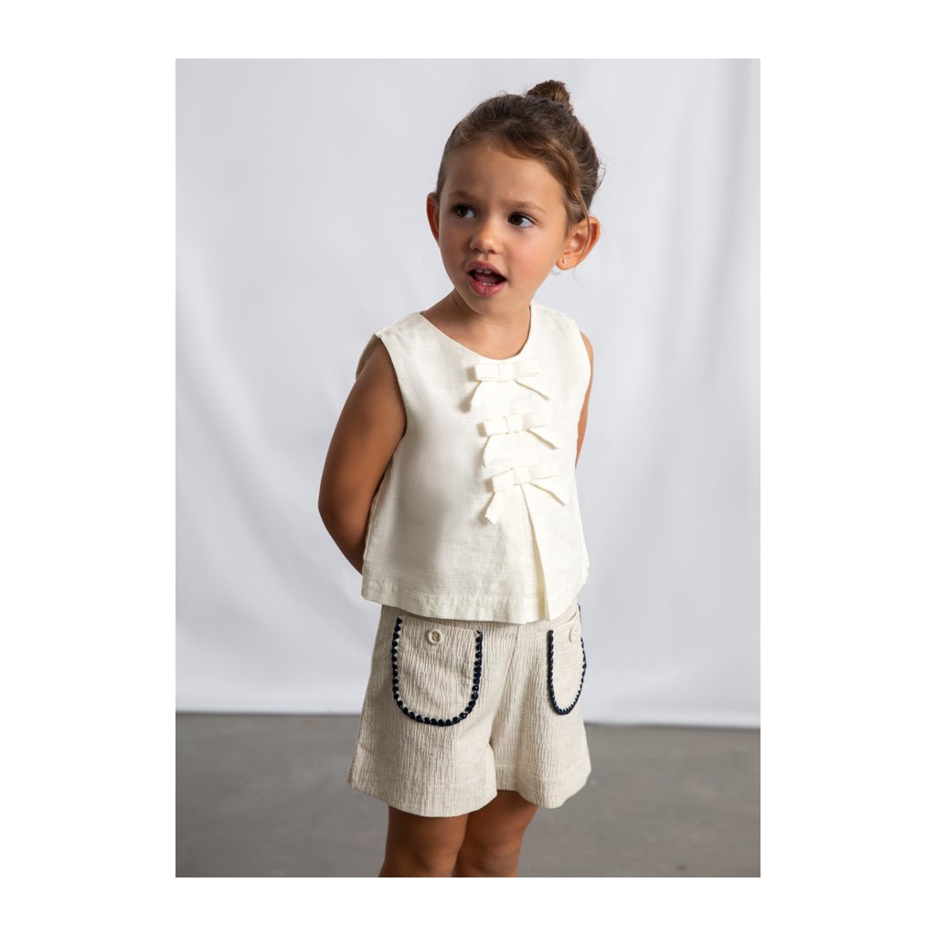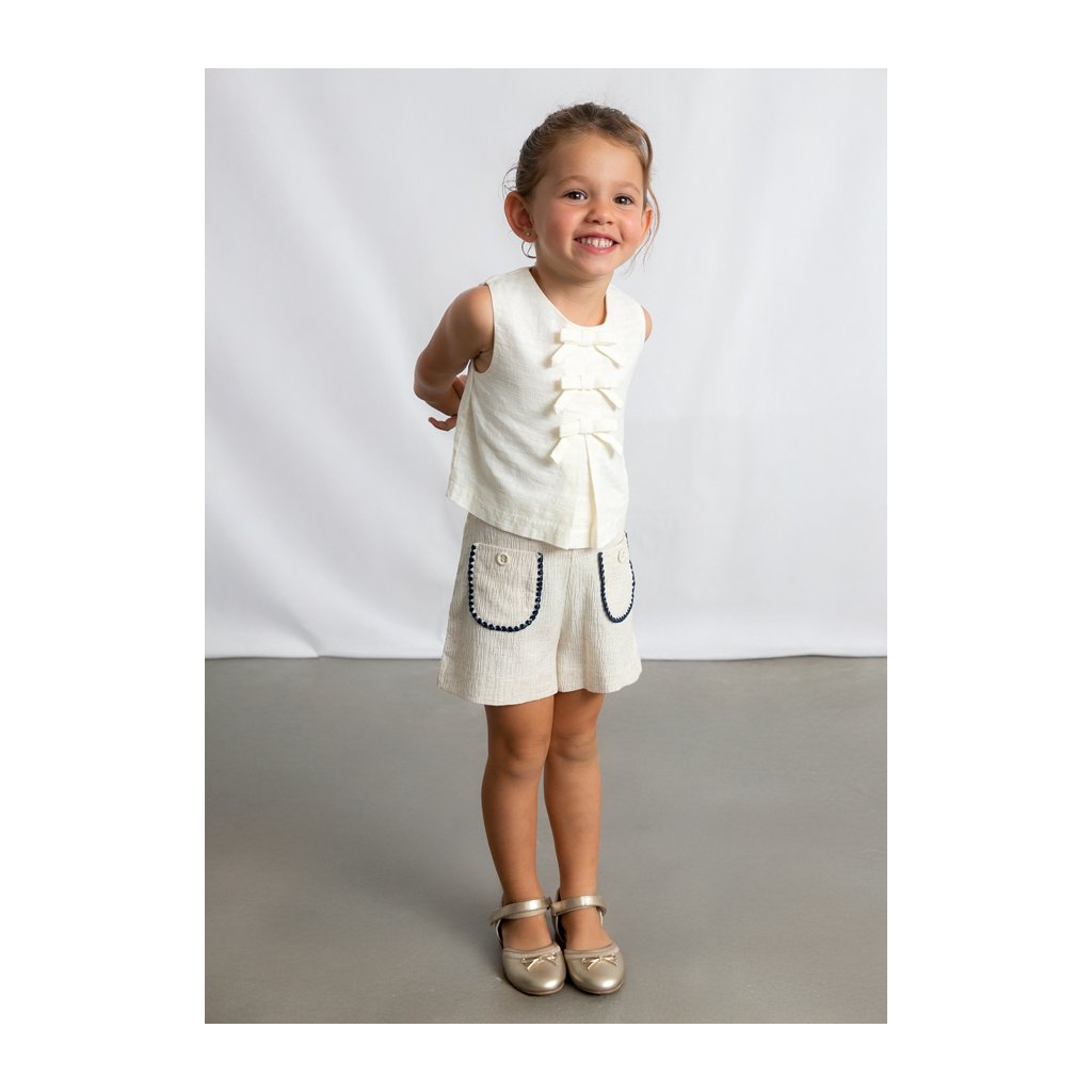 Dievčenské krátke nohavice v béžovej farbe sú štýlovým a praktickým kúskom na teplé dni. Vyrobené sú z nekrčivého materiálu, ktorý si zachováva pekný tvar aj pri celodennom nosení. Predné vrecká s jemným modrým lemovaním dodávajú nohaviciam moderný a hravý vzhľad. Nohavice sú pohodlné, ľahko kombinovateľné a vhodné na bežné nosenie aj slávnostnejšie príležitosti.