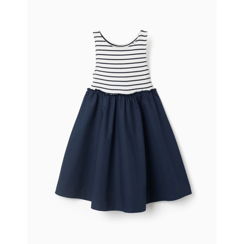 Štýlové a pohodlné letné šaty, ktoré si každé dievčatko zamiluje. Vrchná časť v bielo-modrom pruhovanom dizajne pôsobí sviežo a hravo, zatiaľ čo tmavomodrá suknička dodáva šatám elegantný kontrast.
