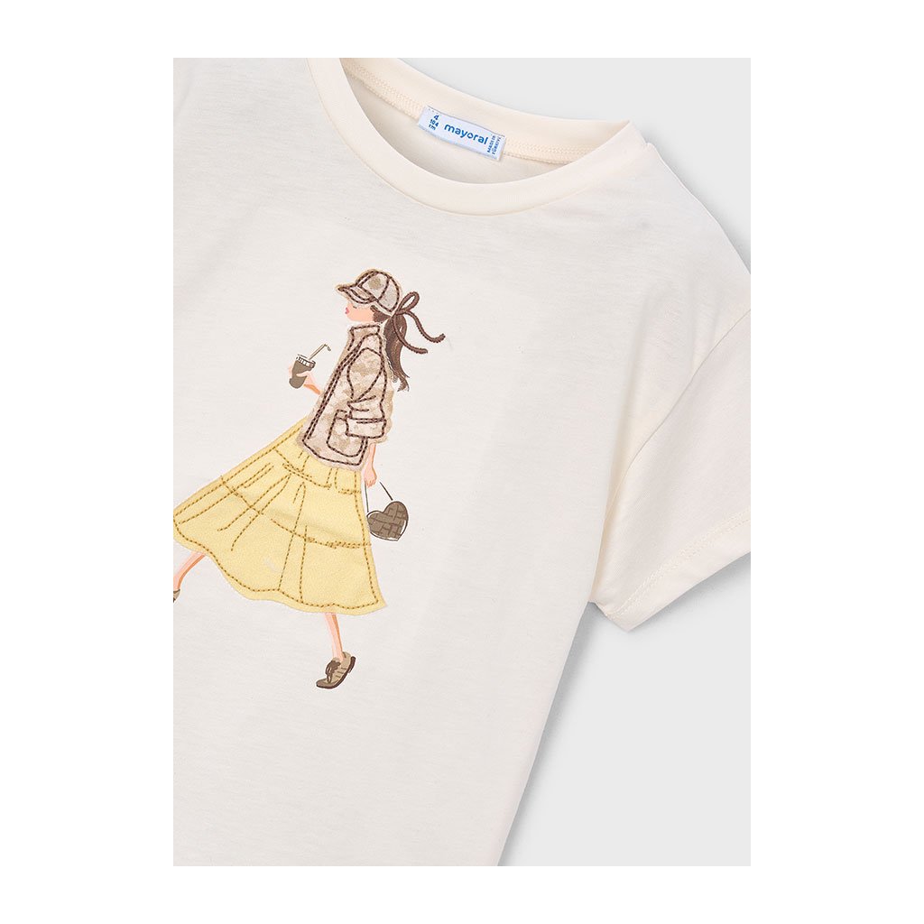 Dievčenské tričko Mayoral z mäkkej kvalitnej bavlny s krátkym rukávom. Na prednej strane má nádhernú dekoratívnu aplikáciu, ktorá dodáva tričku šmrnc a hravosť. Tričko má klasický strih s okrúhlym výstrihom a ľahko sa kombinuje s nohavicami, sukňou či legínami. Ideálne ako samostatný kúsok alebo do vrstveného outfitu pre každú sezónu