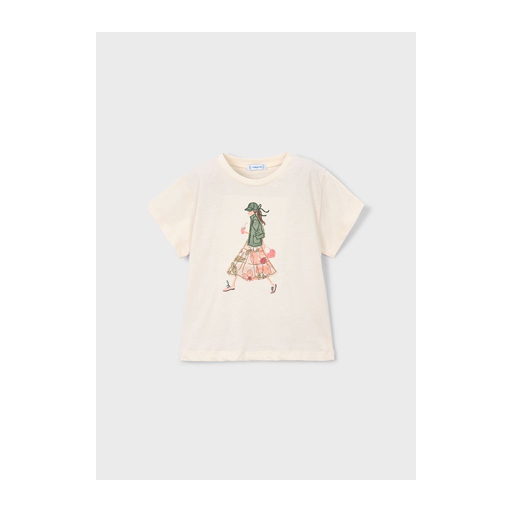 Dievčenské tričko Mayoral z mäkkej kvalitnej bavlny s krátkym rukávom.  Na prednej strane má nádhernú dekoratívnu aplikáciu, ktorá dodáva tričku šmrnc a hravosť. Tričko má klasický strih s okrúhlym výstrihom a ľahko sa kombinuje s nohavicami, sukňou či legínami. Ideálne ako samostatný kúsok alebo do vrstveného outfitu pre každú sezónu