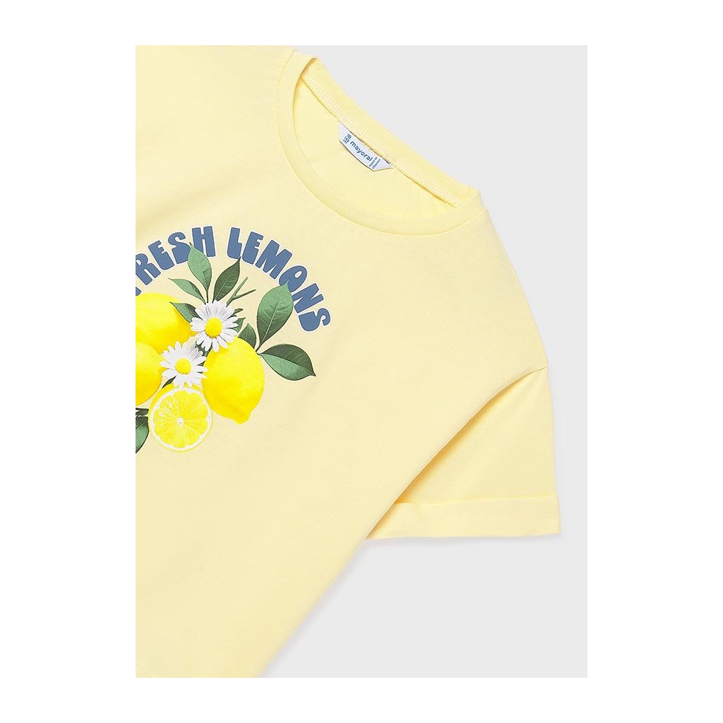 Veselé dievčenské tričko v žltej farbe s potlačou citrónov je ideálnym kúskom na teplé dni. Letný motív pôsobí sviežo a hravo, zatiaľ čo malý výstrih pri krku zabezpečuje pohodlné nosenie. Potlač sa nachádza vpredu aj vzadu, čo dodáva tričku moderný vzhľad.