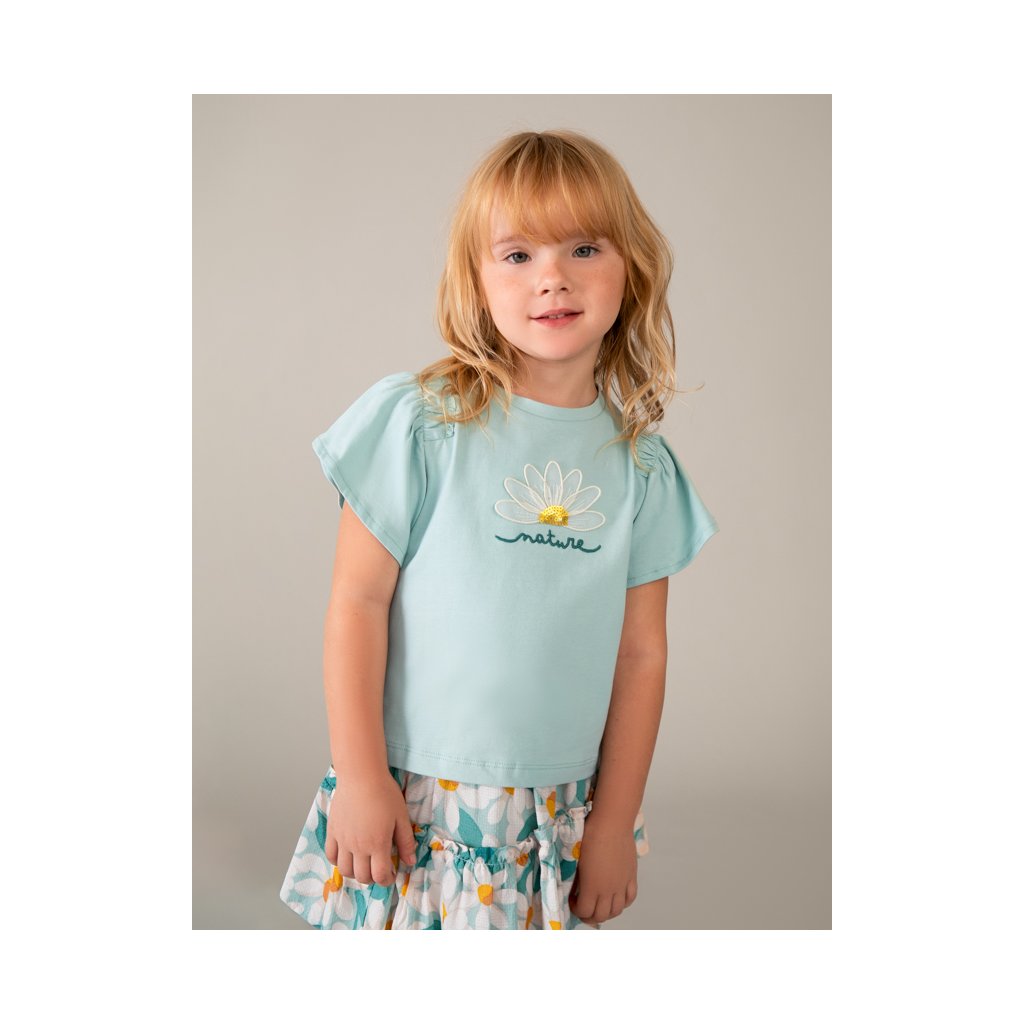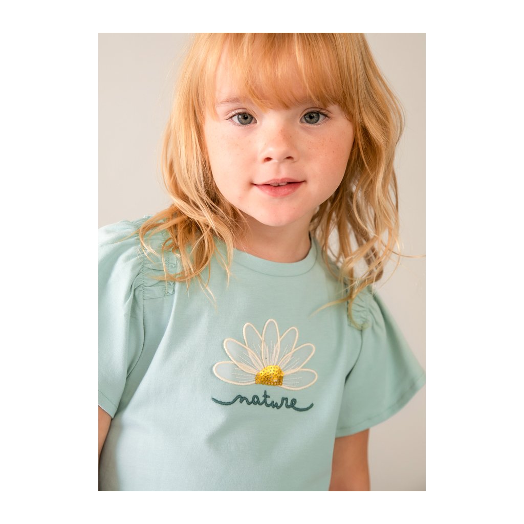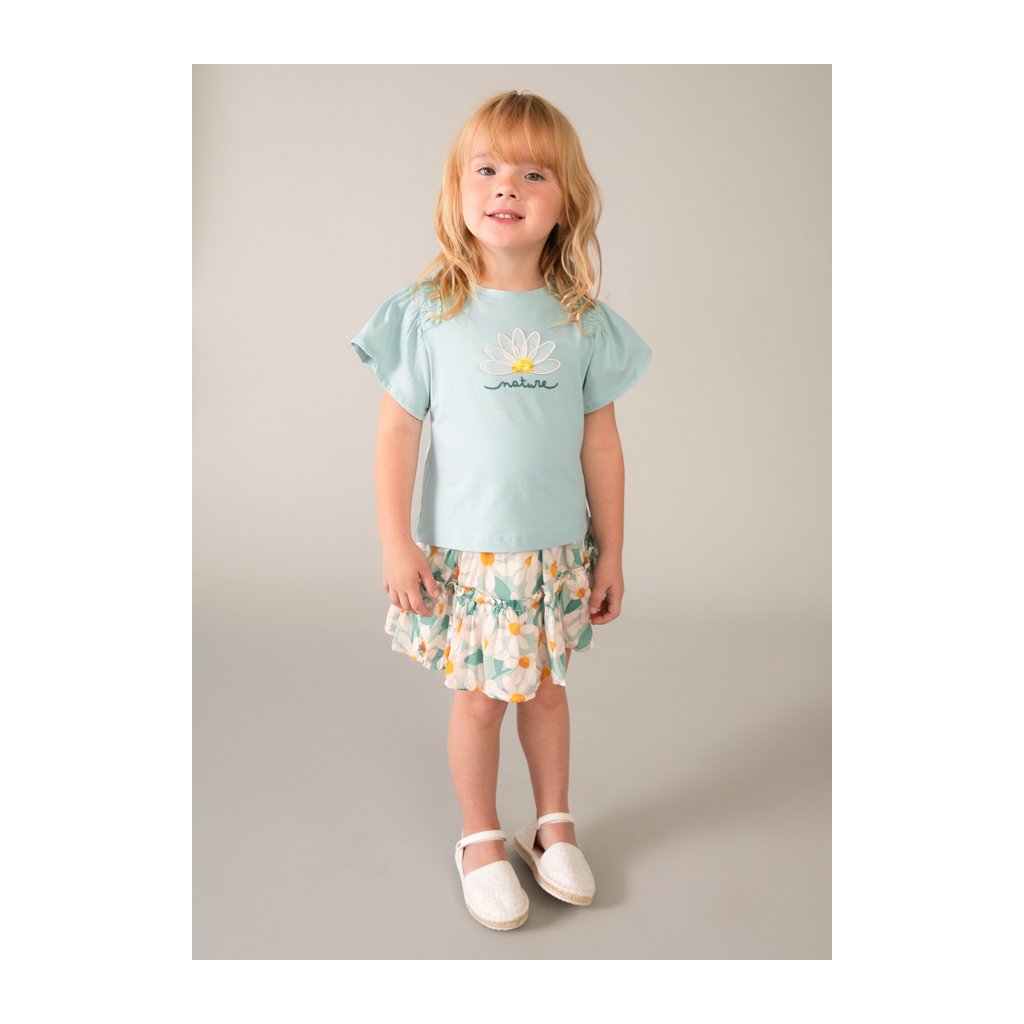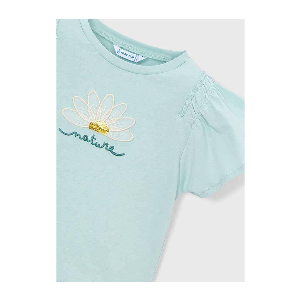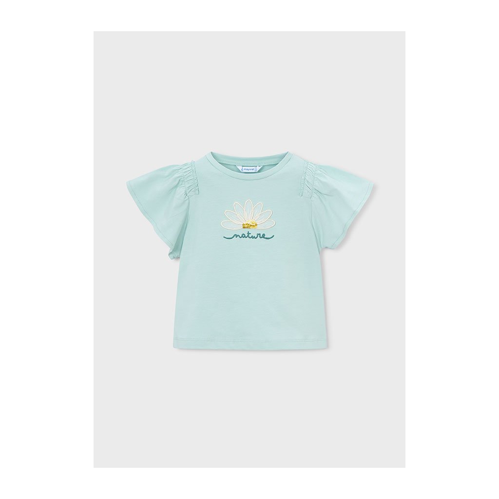 Dievčenské tričko značky Mayoral z príjemnej bavlny, ktorá zabezpečuje pohodlie počas celého dňa. Má krátky rukáv voľnejšieho strihu v štýle jemného volánika, ktorý pôsobí dievčensky a elegantne. Prednú časť zdobí pekná aplikácia, ktorá dodáva tričku originálny vzhľad. Skvelo sa kombinuje s nohavicami, sukňou aj legínami a je ideálne na každodenné nosenie.