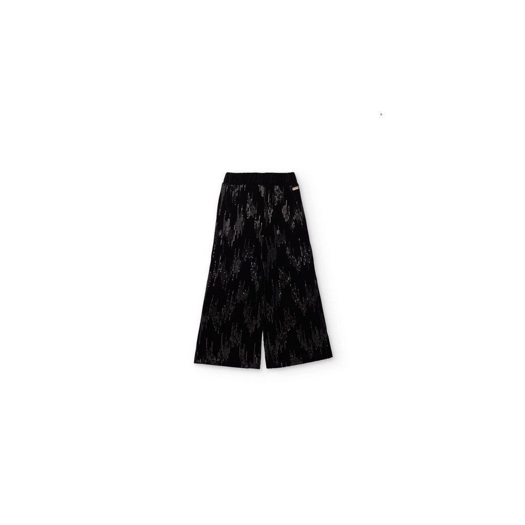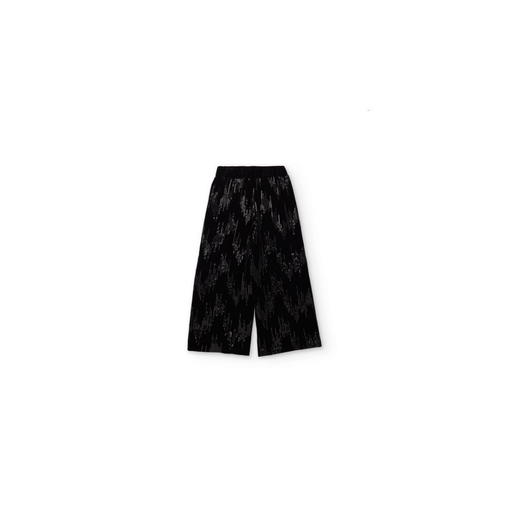 Elegantné dievčenské nohavice v čiernej farbe zdobené flitrami, ktoré pôsobia štýlovo a slávnostne. Voľný, padavý strih dodáva modelu ľahkosť a eleganciu, zatiaľ čo elastická gumička v páse zabezpečuje pohodlné nosenie po celý deň. Ideálna voľba na oslavy, párty, spoločenské udalosti či iné slávnostné príležitosti, kde chce každá malá parádnica zažiariť.