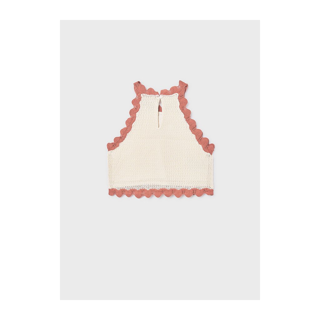 Háčkovaný top na ramienka pre teenagerky je štýlový kúsok ideálny na letné dni. Jemný háčkovaný vzhľad pôsobí romanticky a trendy, zatiaľ čo drobné kvietky vpredu dodávajú topu dievčenský a originálny detail. Ľahký a vzdušný materiál zabezpečuje pohodlie aj počas teplého počasia. Top sa skvele kombinuje s kraťasmi, sukňou či džínsami a je vhodný na voľný čas, prechádzky aj letné festivaly.