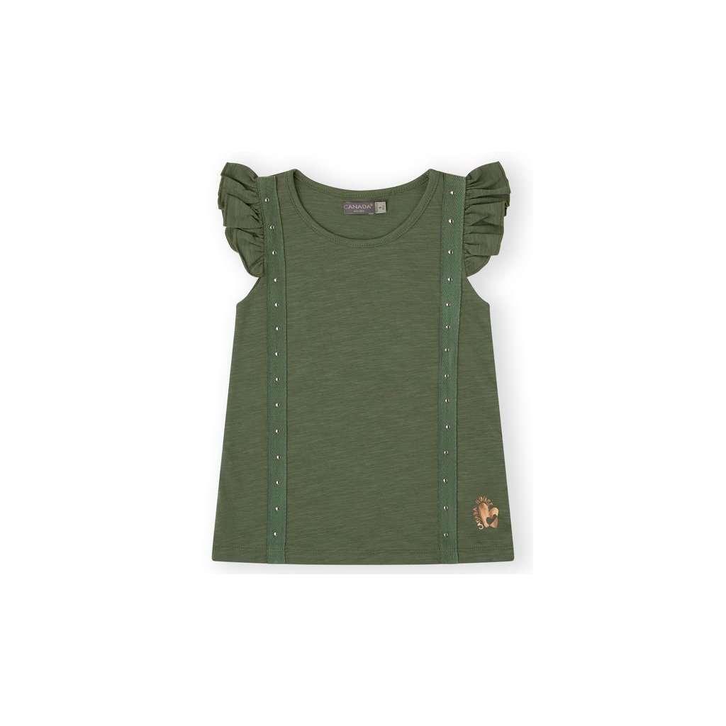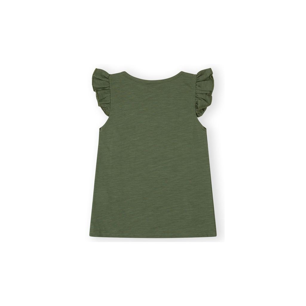 Ľahký a vzdušný top v elegantnom olivovom odtieni, doplnený jemnými volánmi pre dievčenský a štýlový vzhľad. Ideálny na teplé letné dni.