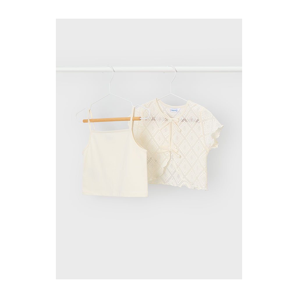 Mayoral tielko a čipkový top na zaväzovanie je ideálna voľba pre horúce letné dni. Tento dvojitý kúsok kombinuje praktickosť pohodlného tielka s romantickým vzhľadom čipkového topu, ktorý sa dá nosiť samostatne alebo spolu ako originálny outfit. Vďaka ľahkým a vzdušným materiálom je perfektný na denné nosenie, dovolenku či voľnočasové aktivity.