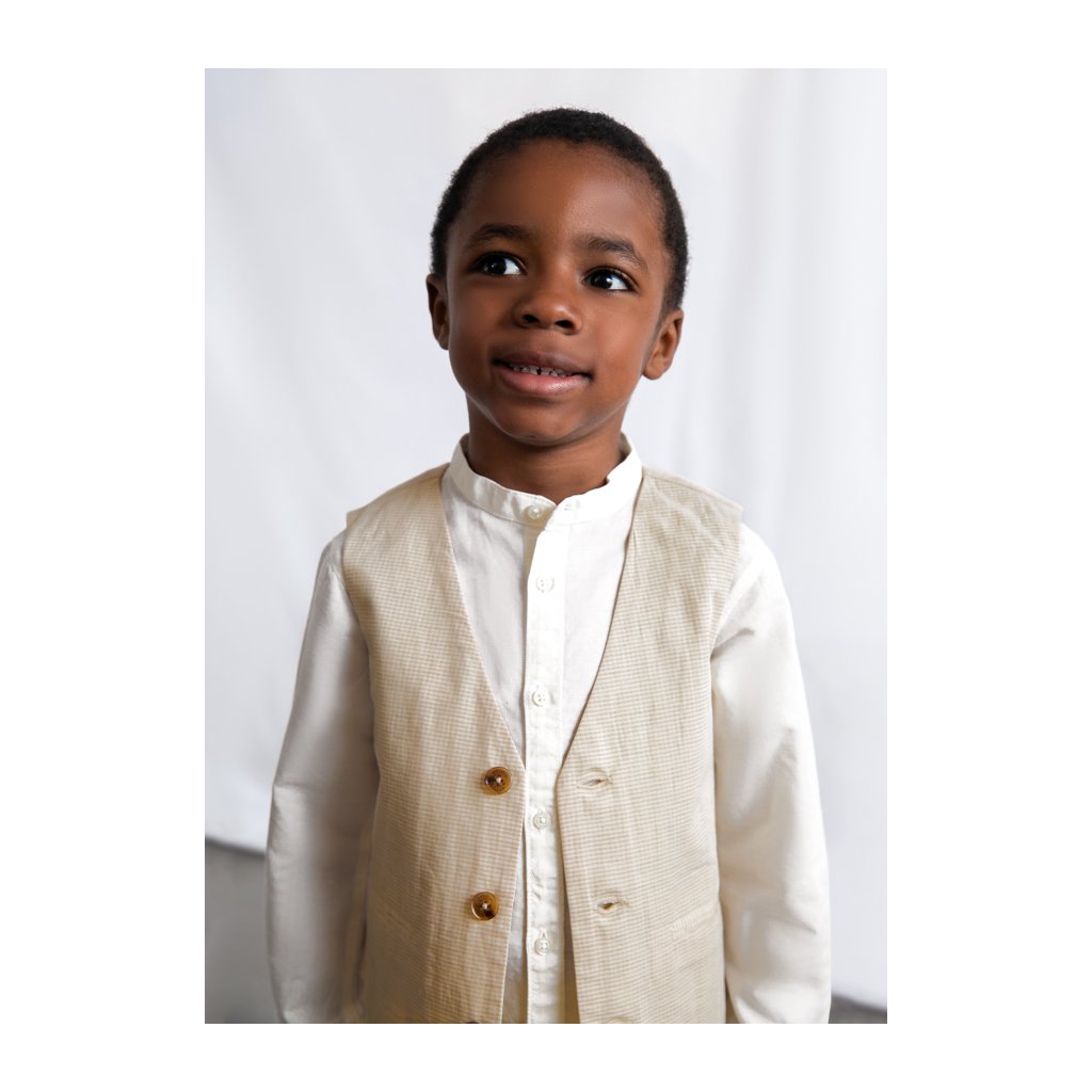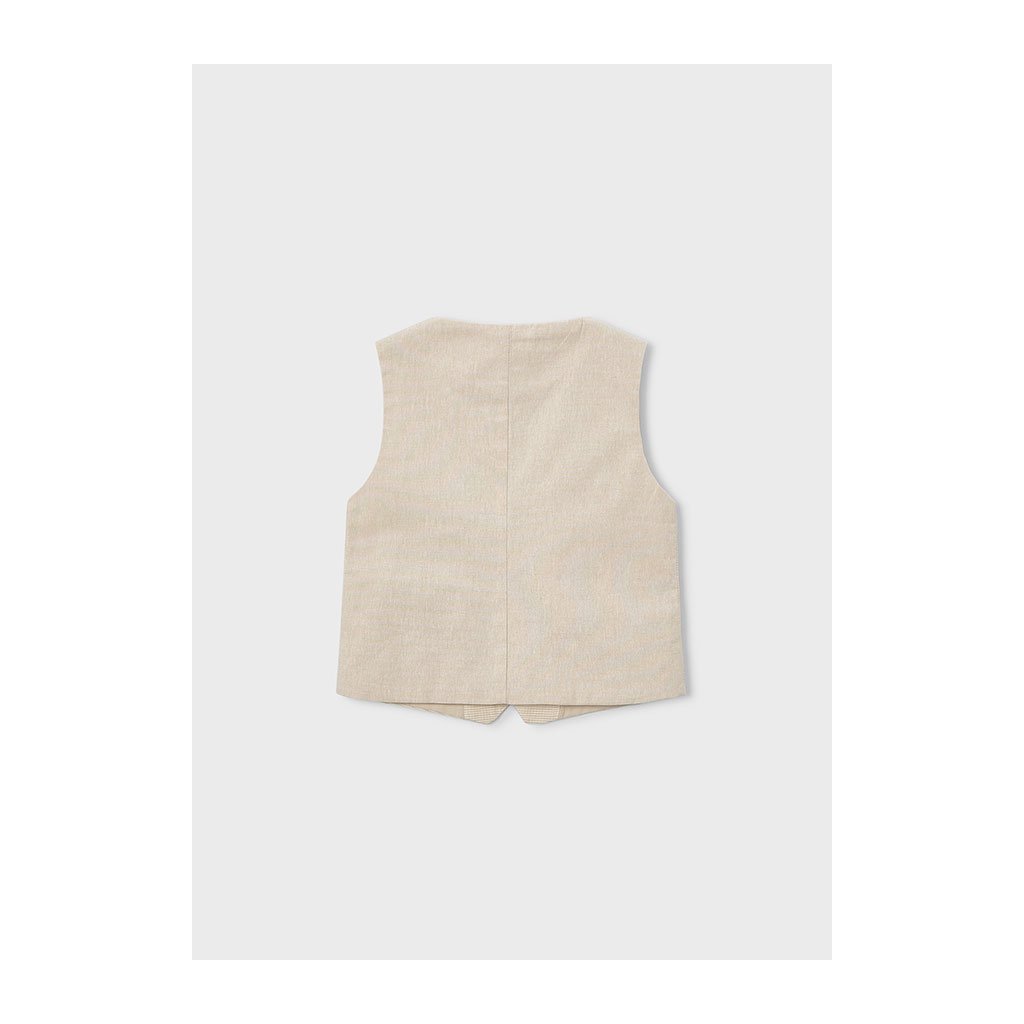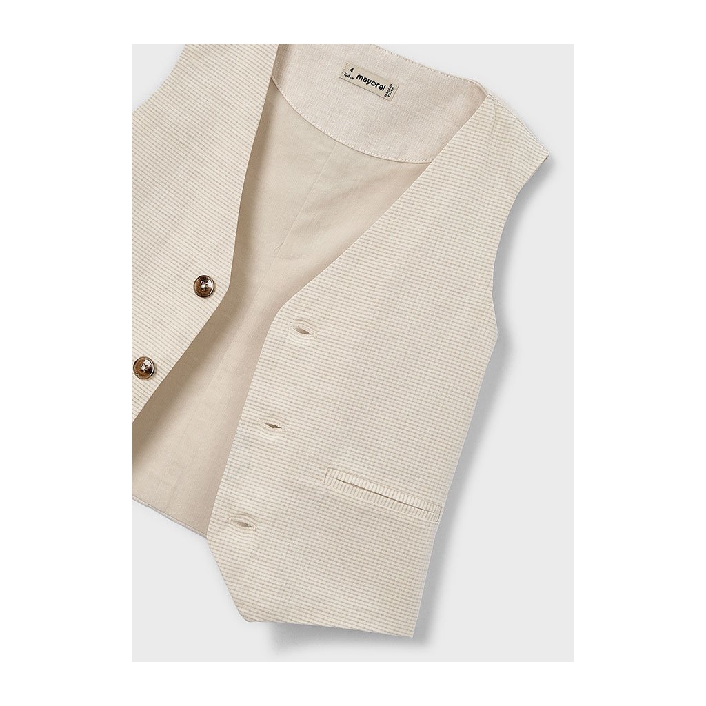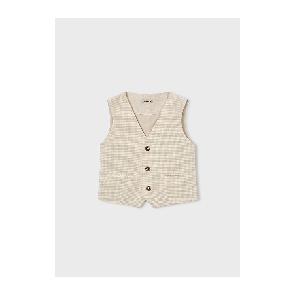Elegantná chlapčenská vesta v béžovej farbe s jemnou kockovanou potlačou je štýlovou voľbou na slávnostné aj bežné príležitosti. Vesta dodáva outfitu sofistikovaný vzhľad a ľahko sa kombinuje s košeľou či tričkom. Kvalitný materiál zabezpečuje pohodlie počas celého dňa.