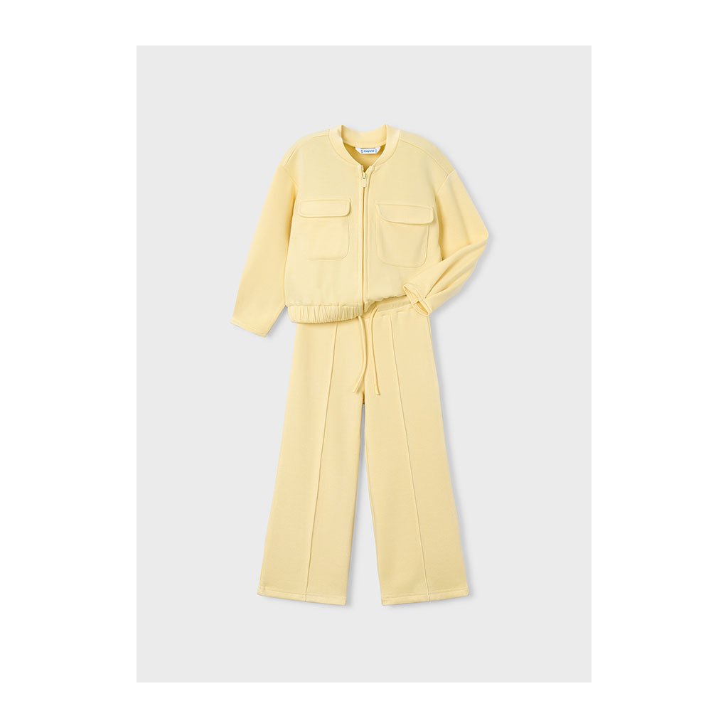 Jemne žltá dvojdielna súprava je vyrobená z príjemného materiálu. Mikina má praktické vačky na prsiach, ktoré dodávajú moderný vzhľad. Široké nohavice sú ozdobené našitými pukmi, vďaka ktorým pôsobí súprava štýlovo a originálne. Súprava je ideálna na voľný čas aj bežné nosenie.