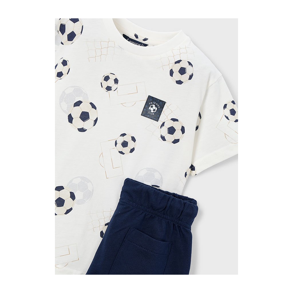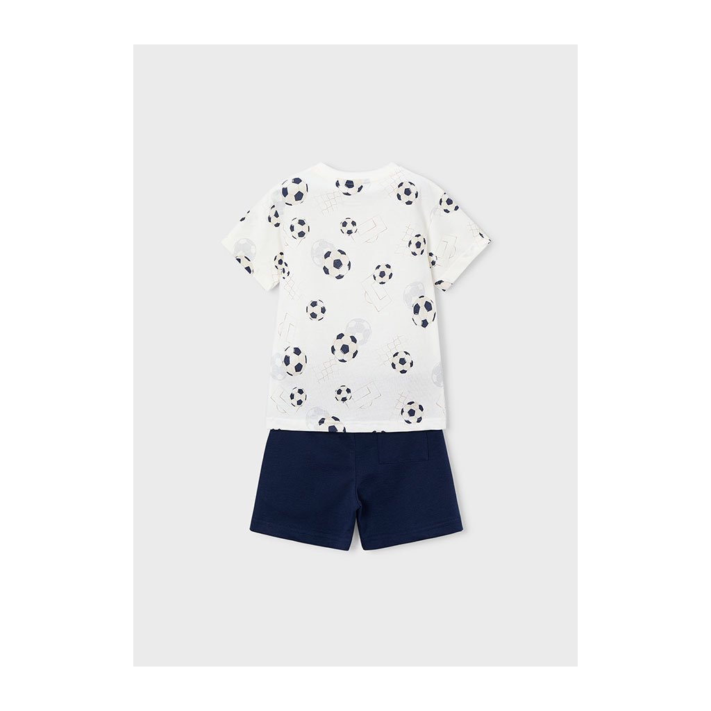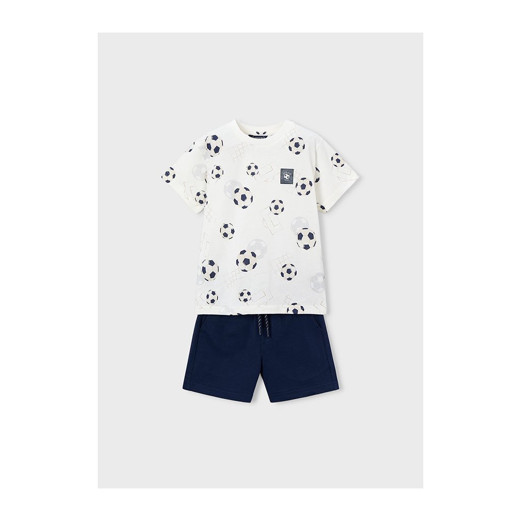 Štýlový 2-dielny letný chlapčenský set, ideálny pre horúce letné dni. Set tvorí pohodlné tričko s krátkym rukávom s potlačou futbalových lôpt. Krátke nohavice sú jednofarebné.