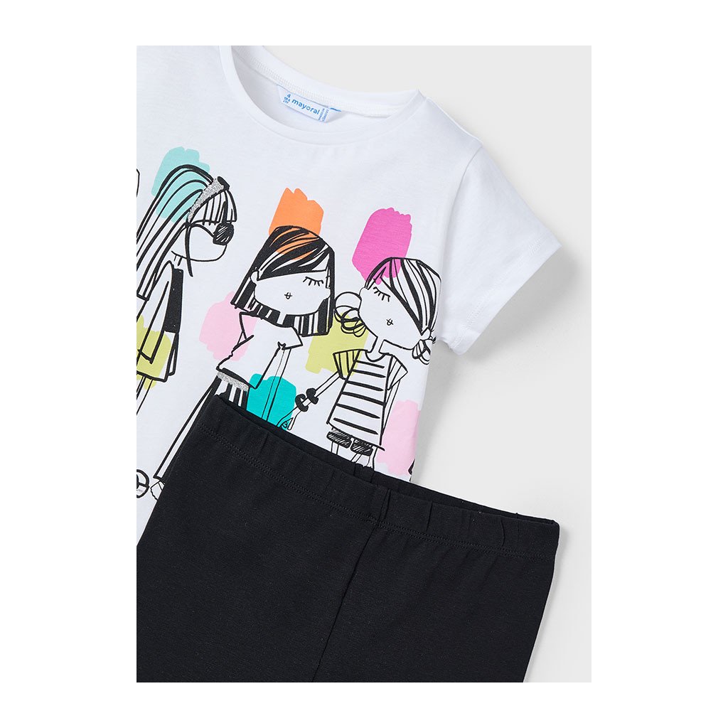 Štýlový a pohodlný 2-dielny dievčenský komplet, ktorý pozostáva z vzorovaného krátkorukávového vrchu a čiernych legín. Vrch je vyrobený z mäkkej bavlny alebo bavlneno-elastanovej zmesi, má krátke rukávy a moderný, hravý vzor, ktorý poteší každú malú slečnu.