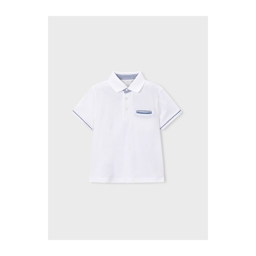 Chlapčenská polokošeľa značky Mayoral na bielom podklade. Má klasický golier a krátke rukávy, vďaka čomu pôsobí elegantne a upravene. Polokošeľa je ideálna na školu, oslavy alebo rodinné príležitosti. Štýlový kúsok, ktorý spája pohodlie s elegantným vzhľadom.