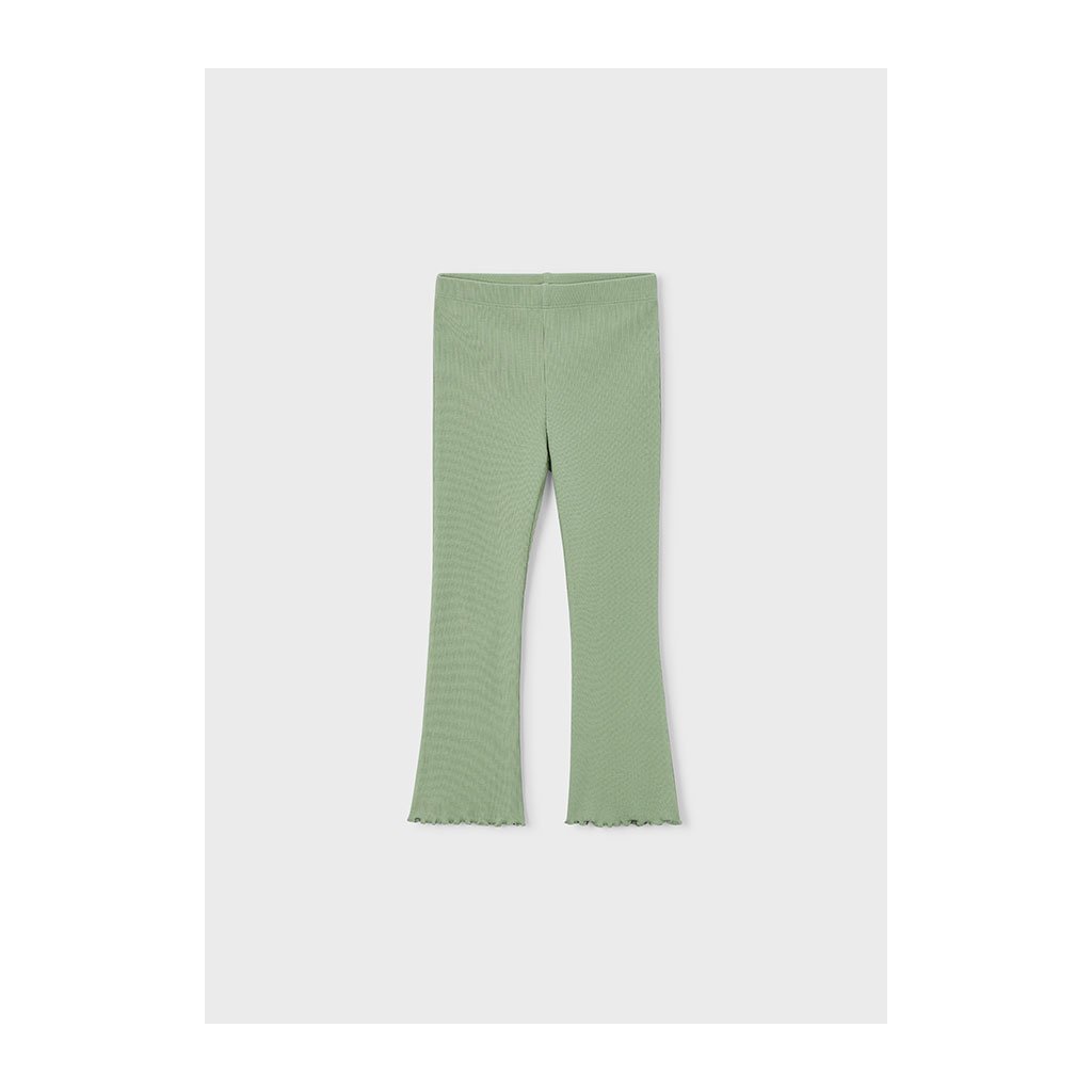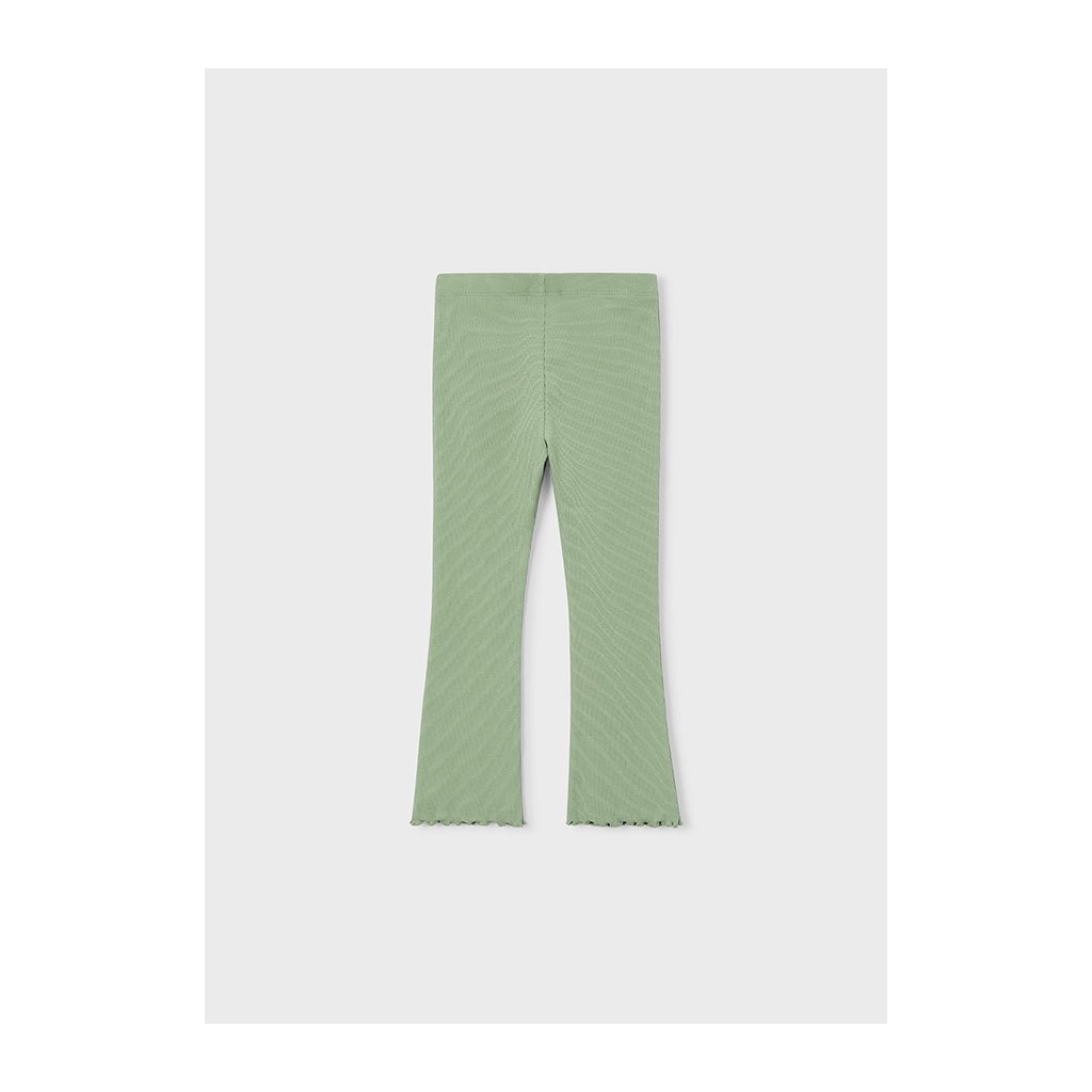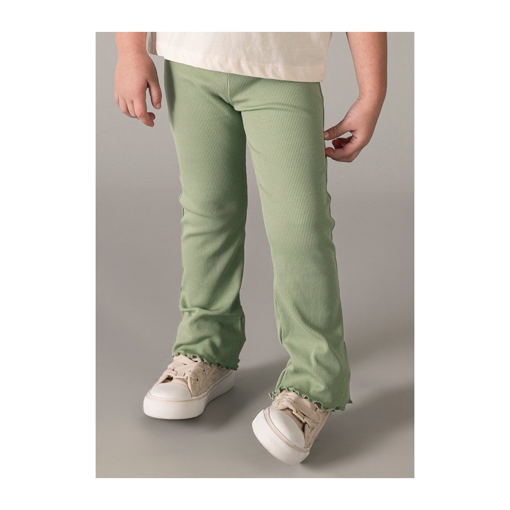 Dievčenské vrúbkované legíny, dole jemne rozšírené, so spodným okrajom lemovaným vlnovkou. Vyrobené z príjemného, pružného materiálu, ktorý zabezpečuje pohodlie pri nosení. V krásnej mint farbe, ideálne na bežné nosenie do školy či skôlky.