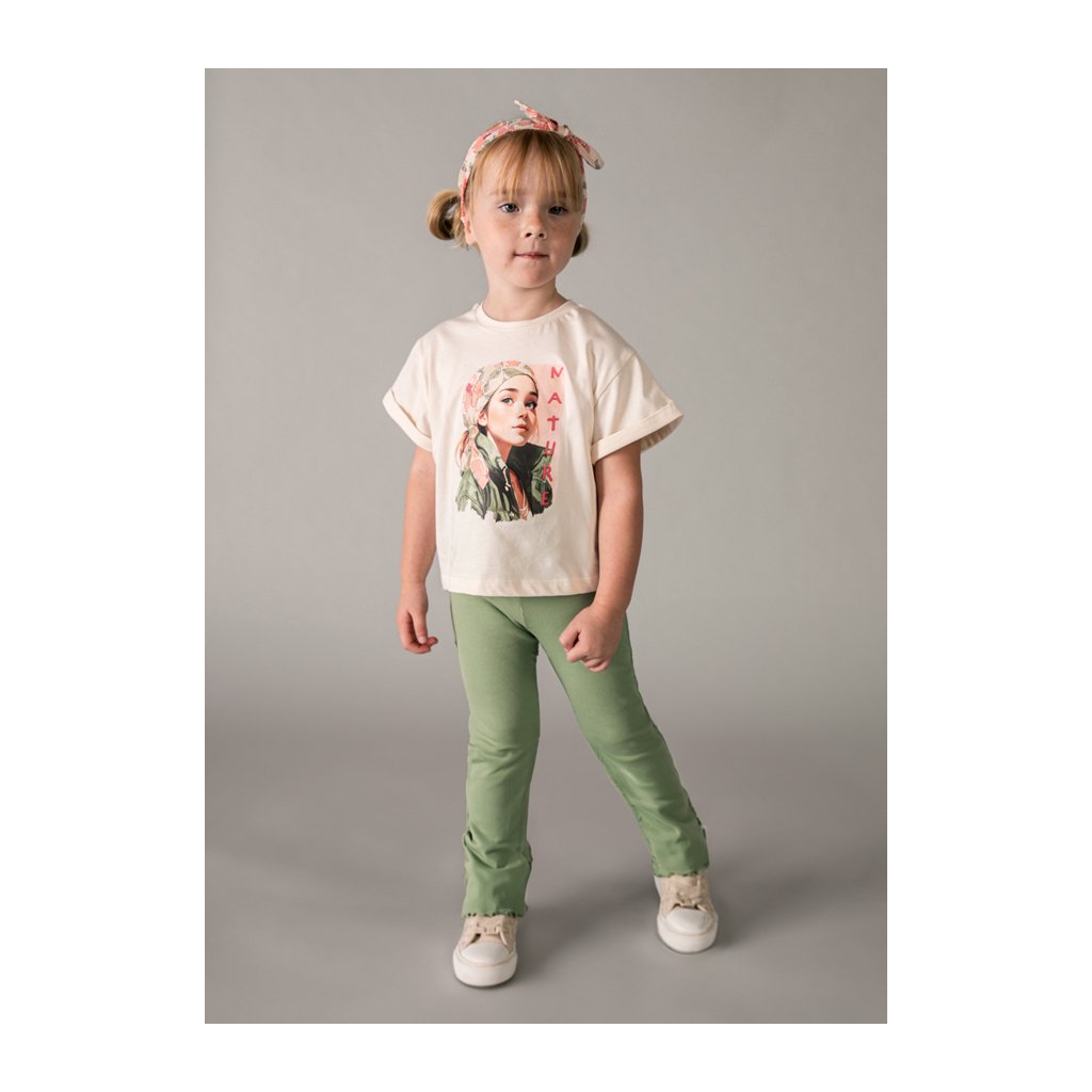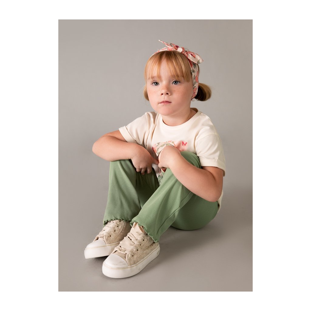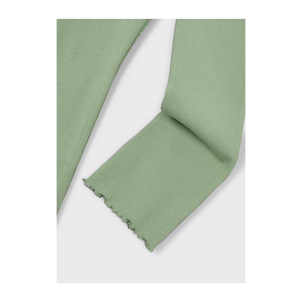 Dievčenské vrúbkované legíny, dole jemne rozšírené, so spodným okrajom lemovaným vlnovkou. Vyrobené z príjemného, pružného materiálu, ktorý zabezpečuje pohodlie pri nosení. V krásnej mint farbe, ideálne na bežné nosenie do školy či skôlky.