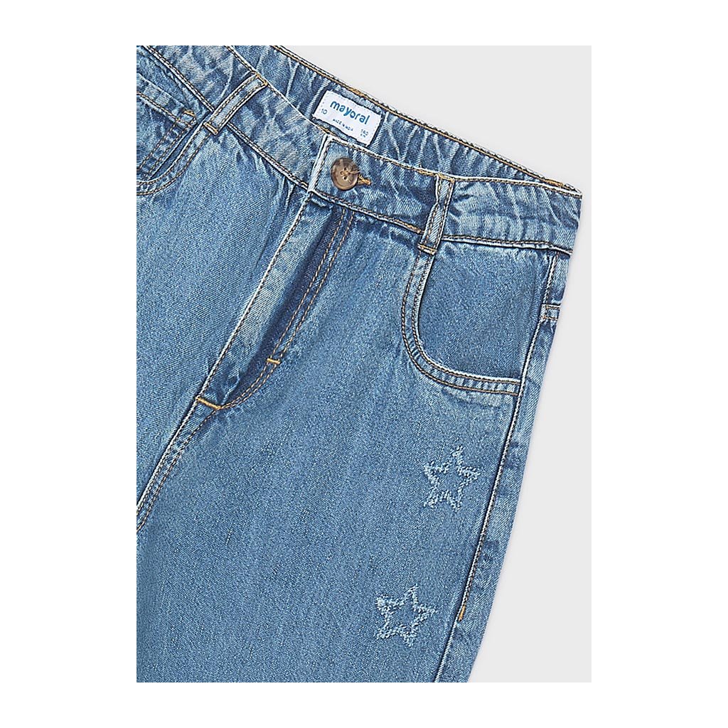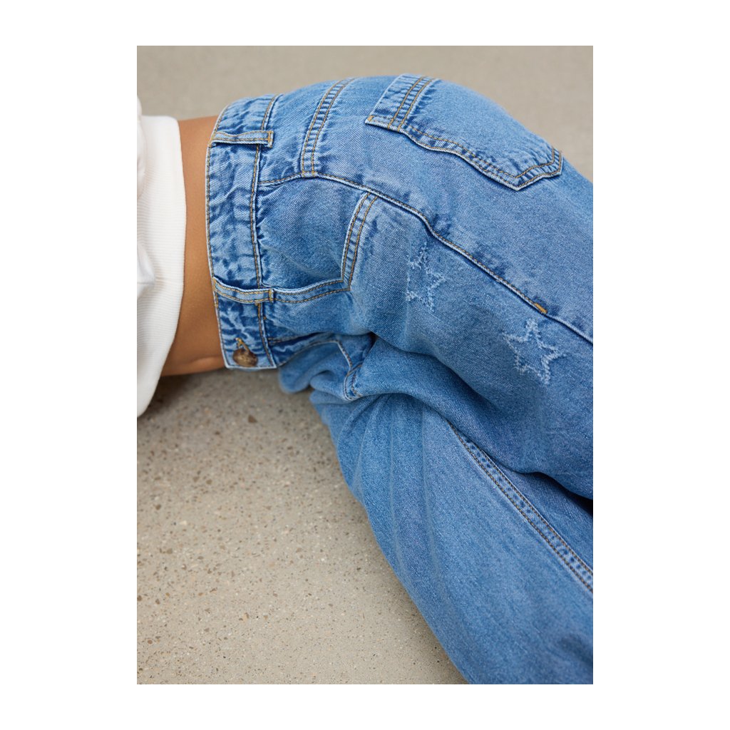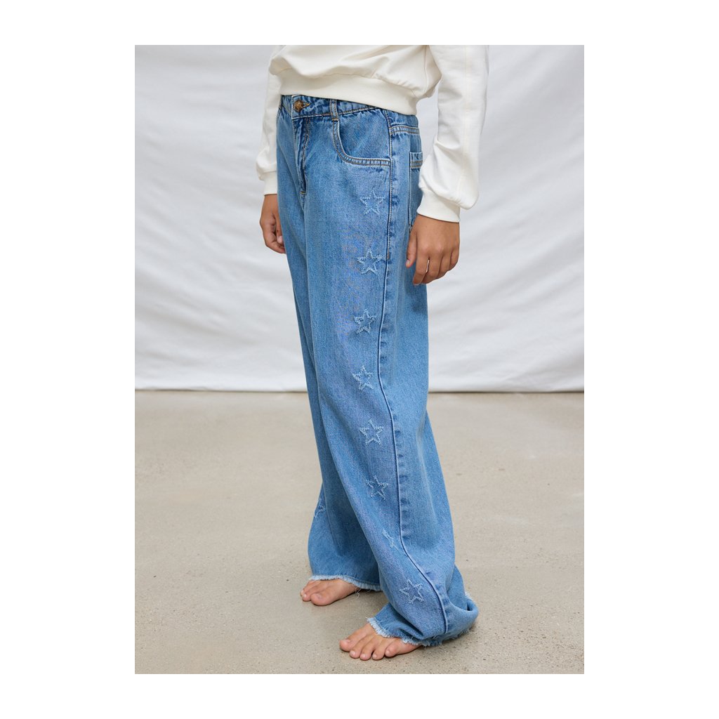 Štýlové dievčenské široké rifle v klasickej modrej farbe sú pohodlné a trendy. Dekoratívne hviezdičky po boku dodávajú rifliam hravý a moderný vzhľad, ktorý zaujme na prvý pohľad.
