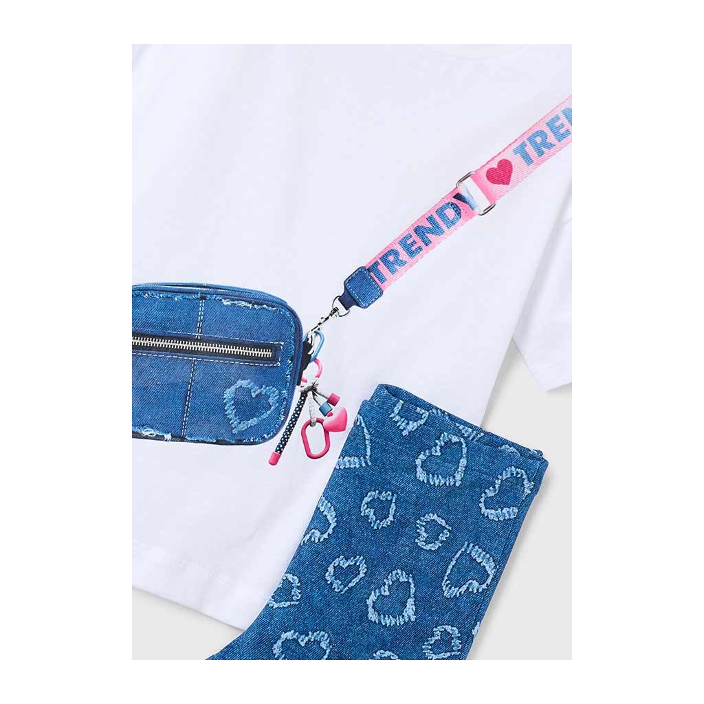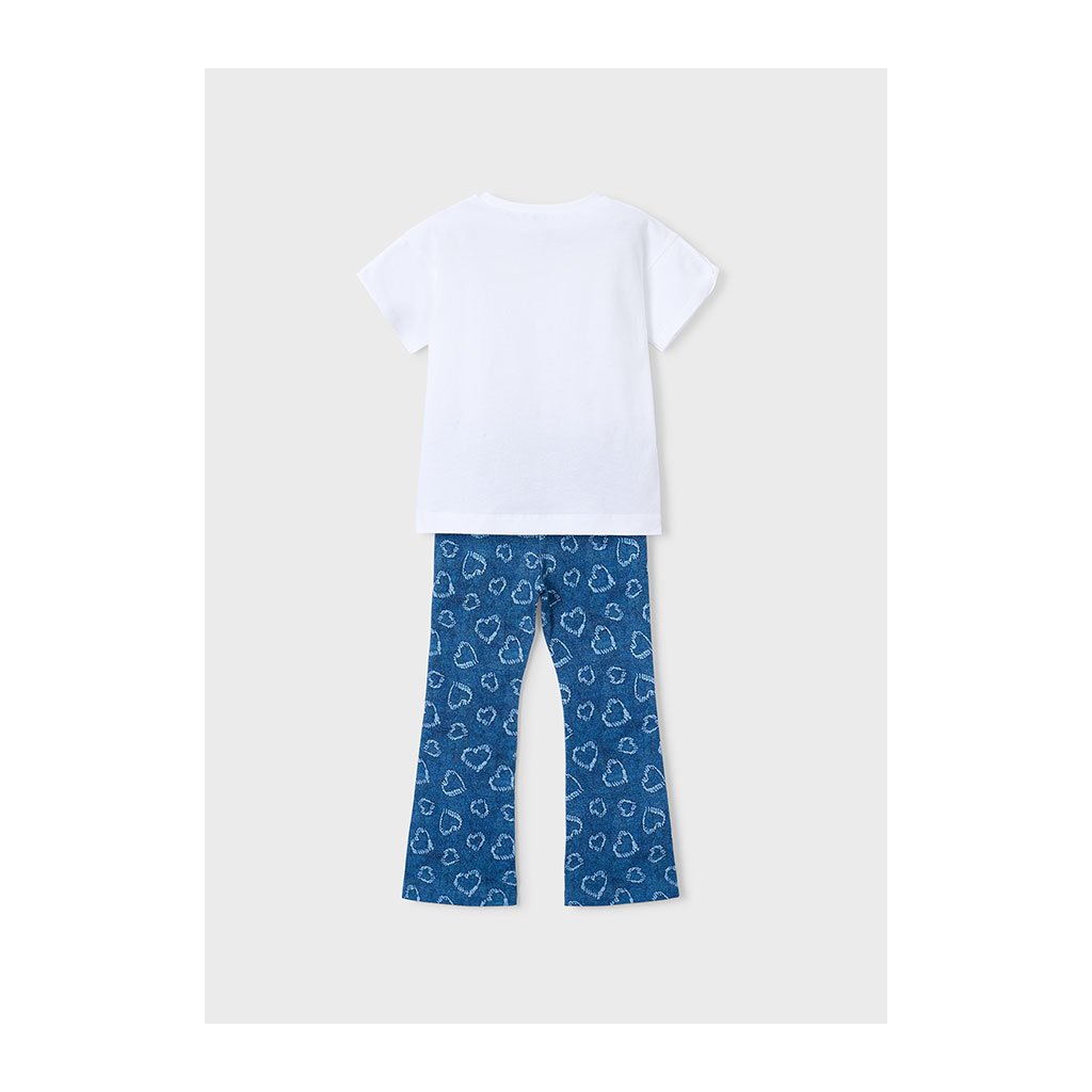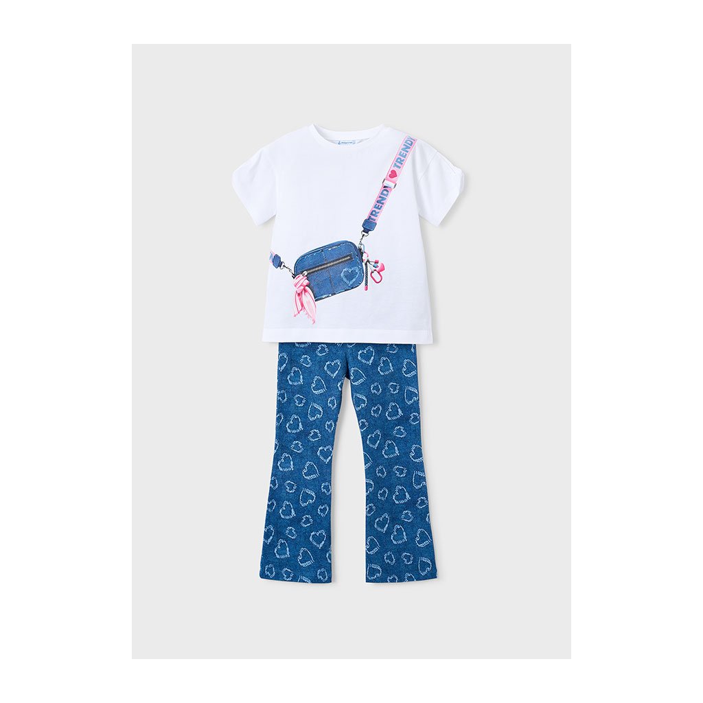 Roztomilý a pohodlný 2-dielny dievčenský set MAYORAL, ktorý pozostáva z trička s obrázkom a farebných elastických legín. s rozšíreným spodkom. Set je kvalitne spracovaný, príjemný na pokožku a vhodný do škôlky, školy, na prechádzky aj domáce nosenie